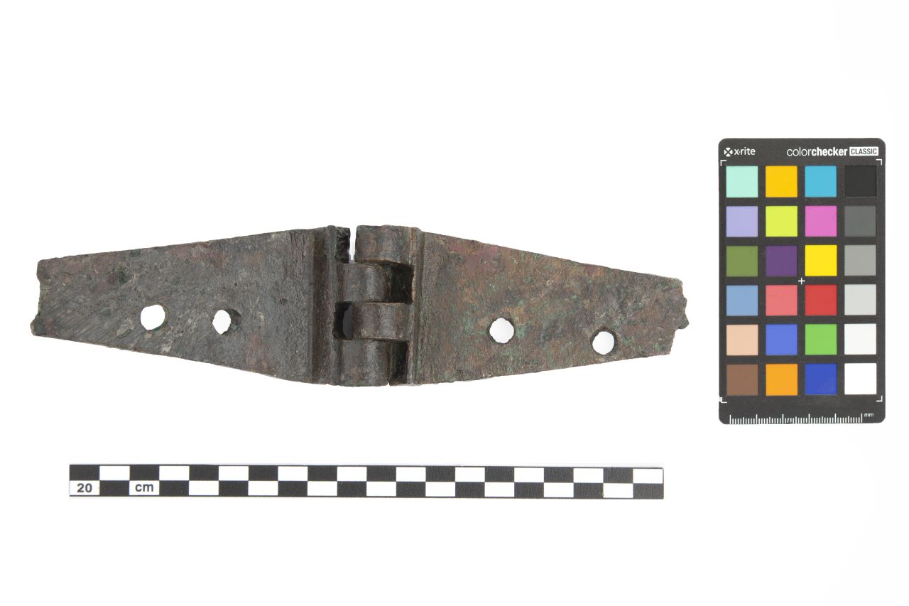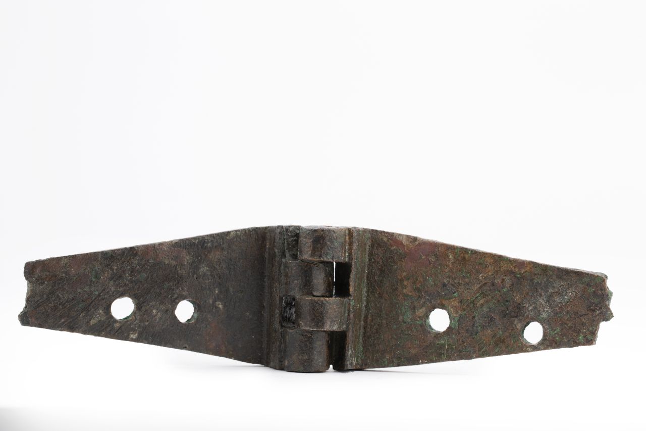 A forma di placca trapezoidale a margine interno ripiegato ad L. Cerniera a quattro larghi anelli cilindrici che conservano ancora tracce del tubolare in ferro. Le placche hanno tre lati profilati e due larghi fori per chiodi di innesto