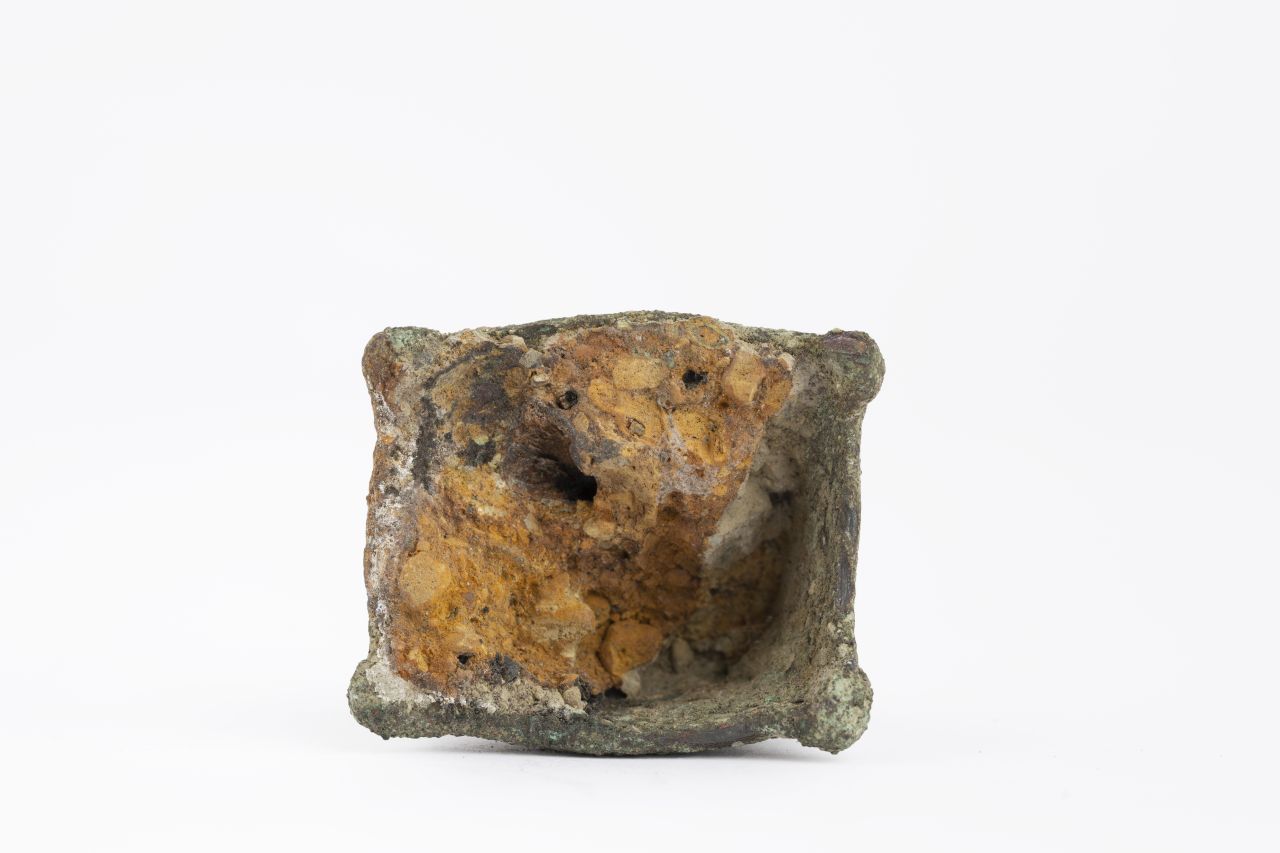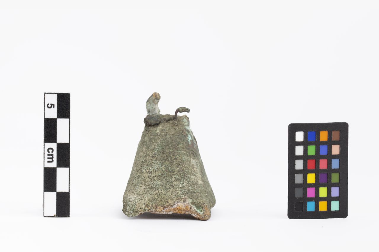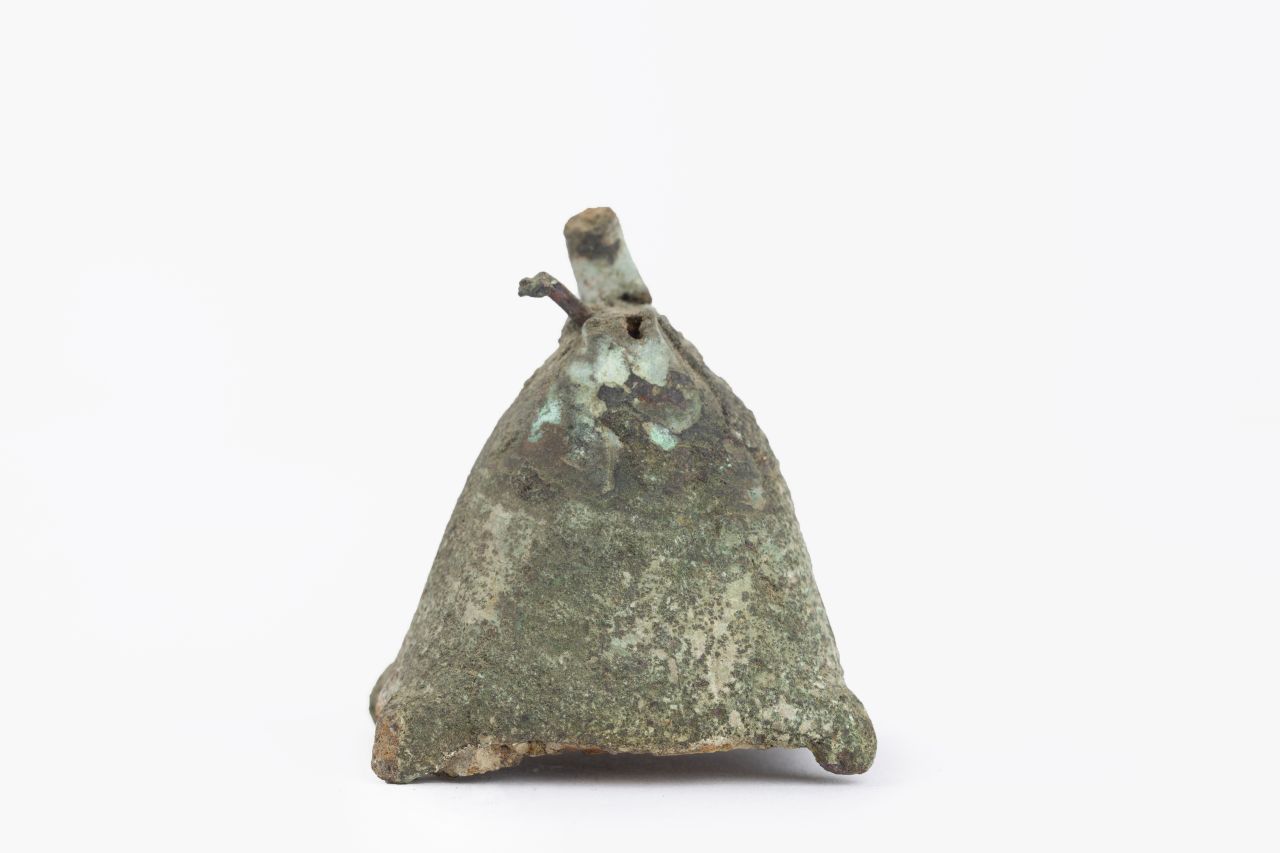 Campanello in bronzo di forma tronco-piramidale con anello apicale, di forma pentagonale, per la prensione a mano o la sua sospensione. La partesottostante l’anello apicale di presa è a forma di calotta a sezione quadrangolare, il corpo ètronco piramidale, con base quadrangolare munita di piedini angolari a globetto schiacciato