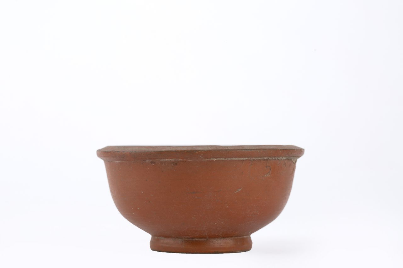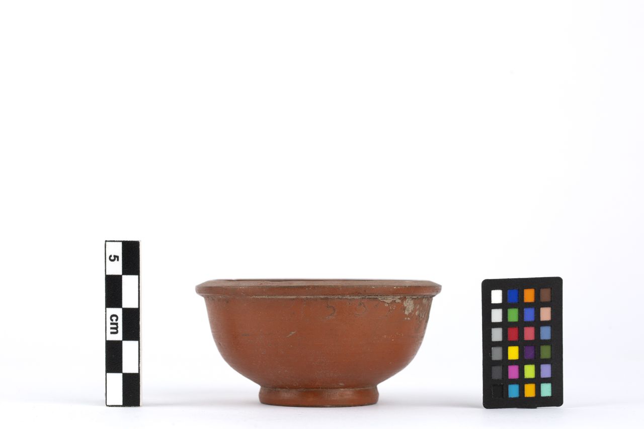 Coppa emisferica con piccolo orlo a tesa a sezione quasi triangolare; piede ad anello