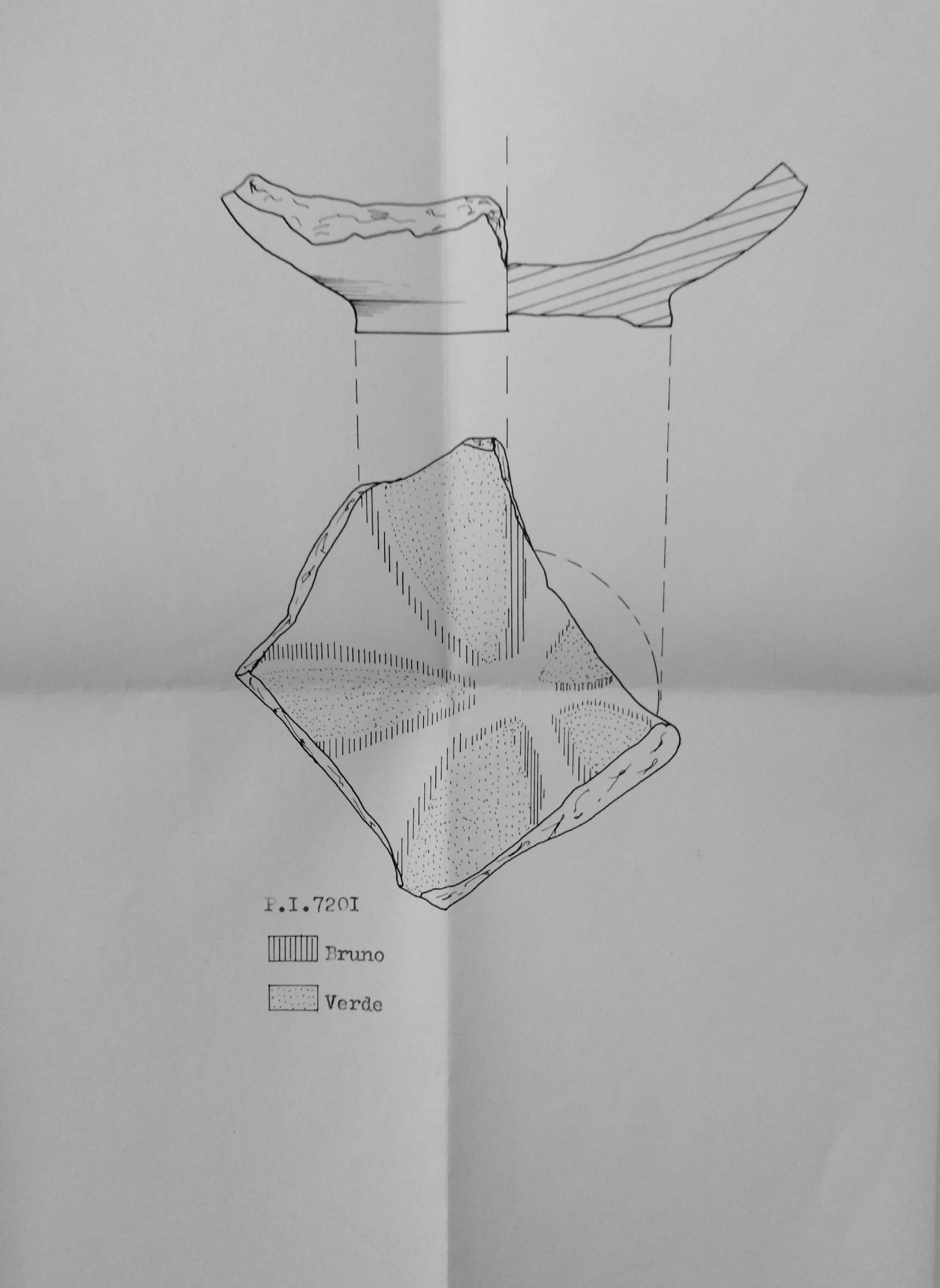 COPPA EMISFERICA CON PIEDE AD ANELLO. LA DECORAZIONE, SOTTO VETRINA TRASPARENTE, è COSTITUITA DA QUATTRO SPIRALI ALTERNATIVAMENTE IN VERDE ED IN BRUNO. LA SUPERFICIE ESTERNA SI PRESENTA RIVESTITA DA UN INGOBBIO ARGILLOSO COLOR ARANCIO