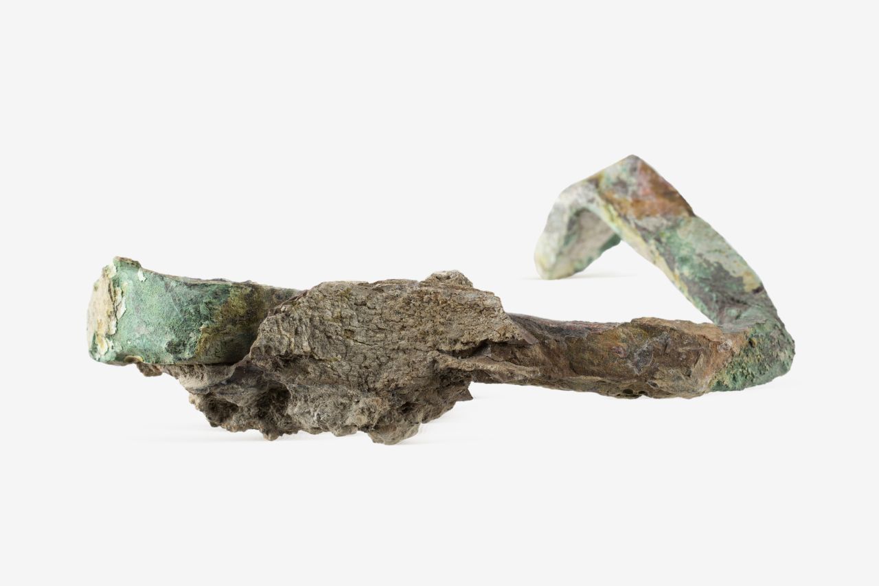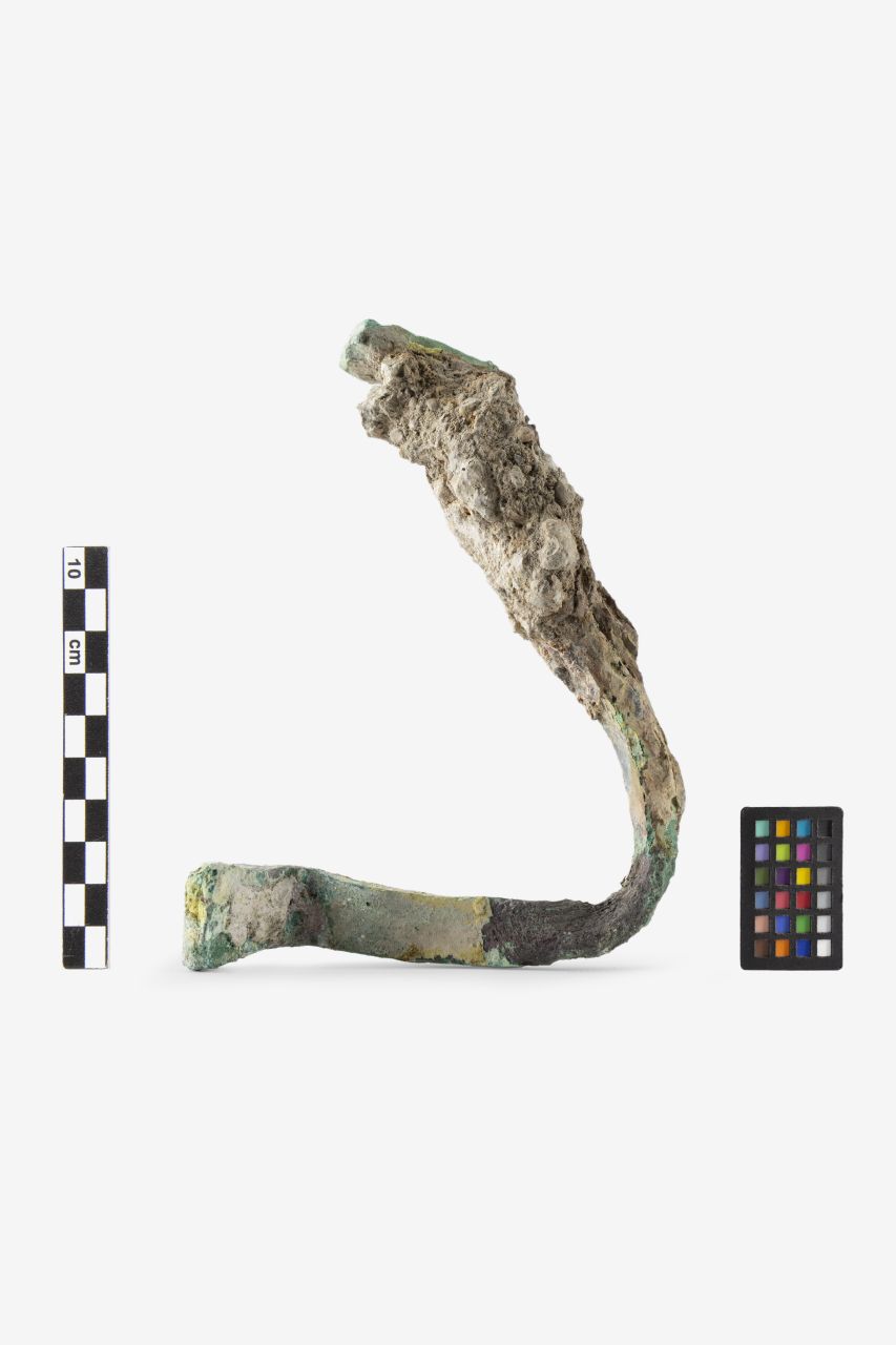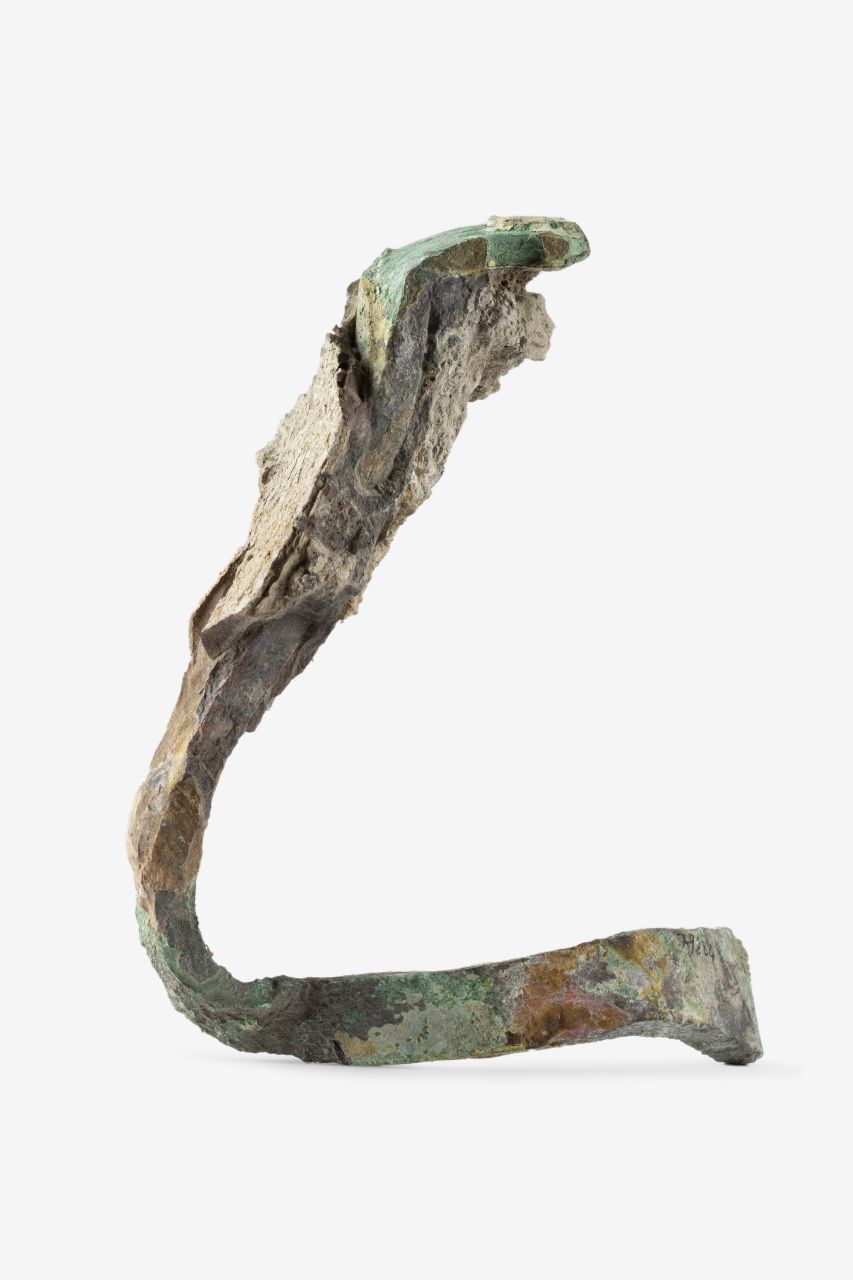 Grappa di bronzo definita del tipo ad U oppure pi greco (Adam 1988). La grappa è costituita da una bacchetta appiattita a sezione rettangolare, con estremità ingrossate e ripiegate