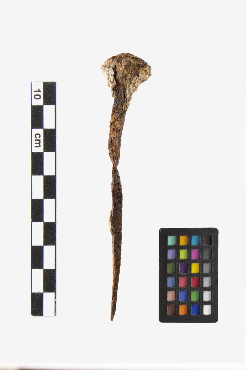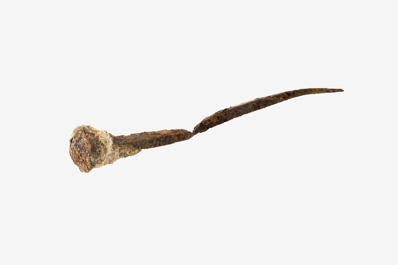 Chiodo in ferro con testa circolare a calotta e gambo a sezione quadrata, con estremità appuntita