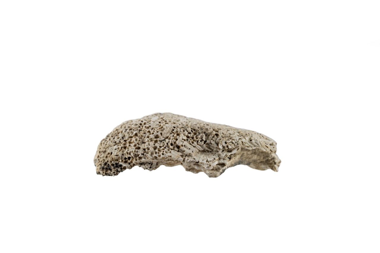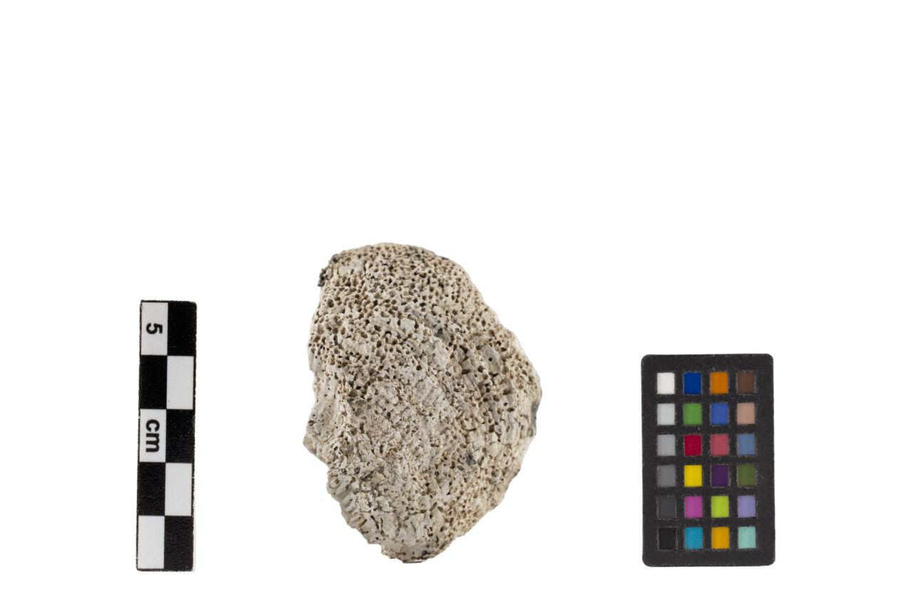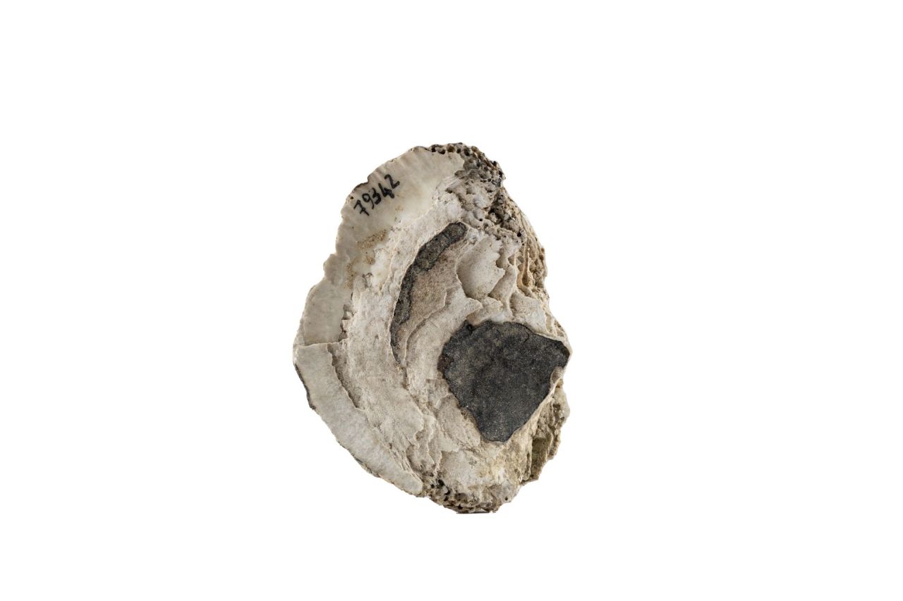 Esemplare di conchiglia appartenente alla famiglia delle bibalve Ostreidae, nel caso specifico una Ostrea edulis. Si conserva solo una delle valve. Sagoma trapezoidale; la faccia esterna è corrosa e completamente soggetta ad un processo di degrado ad alveolizzazione mentre la faccia interna è liscia con venature interne con tracce di incrostazioni laviche