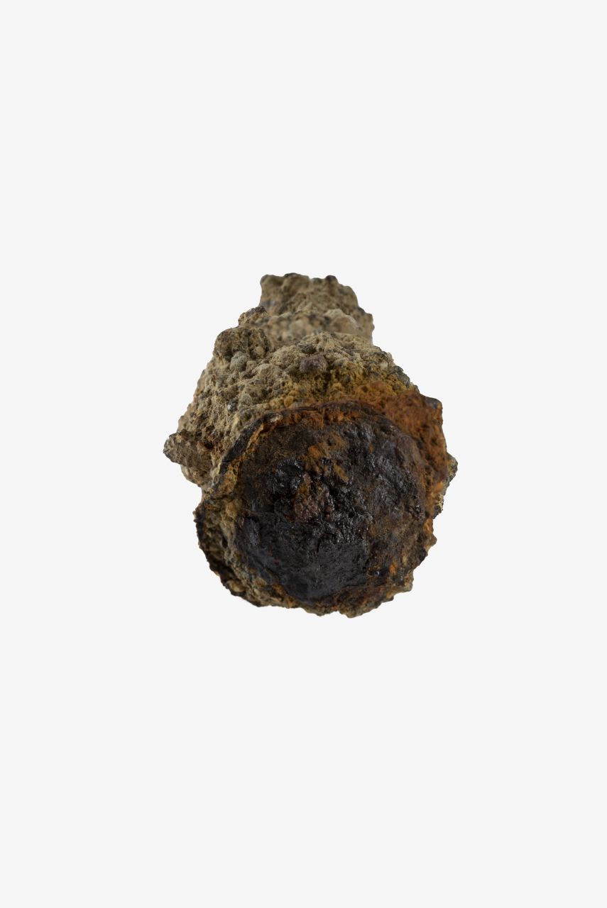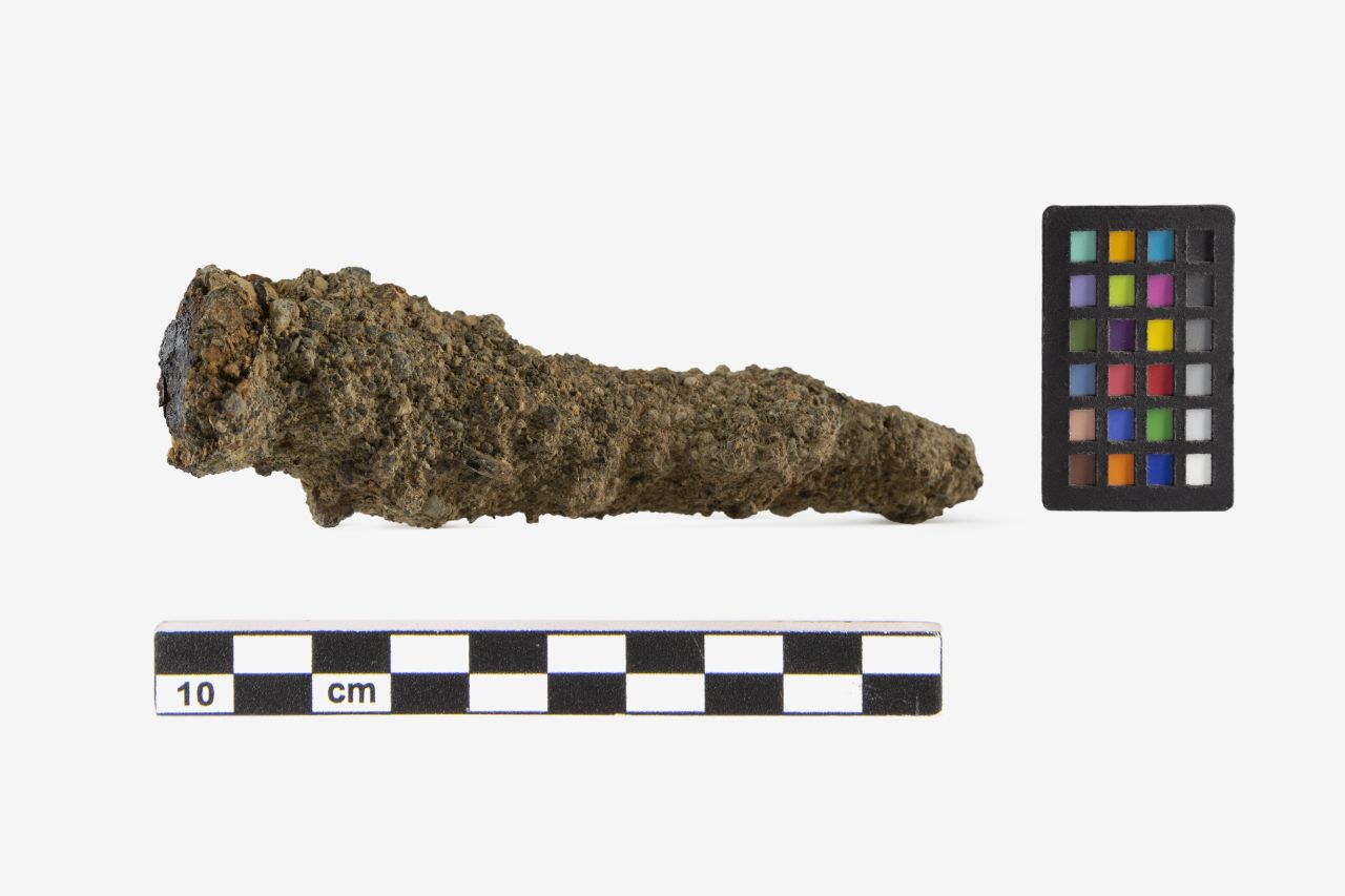 Chiodo in ferro di grandi dimensioni con testa piatta a sezione circolare. La superficie è completamente ricoperta di incrostazioni che non consentono di osservarne la forma dell'asticella