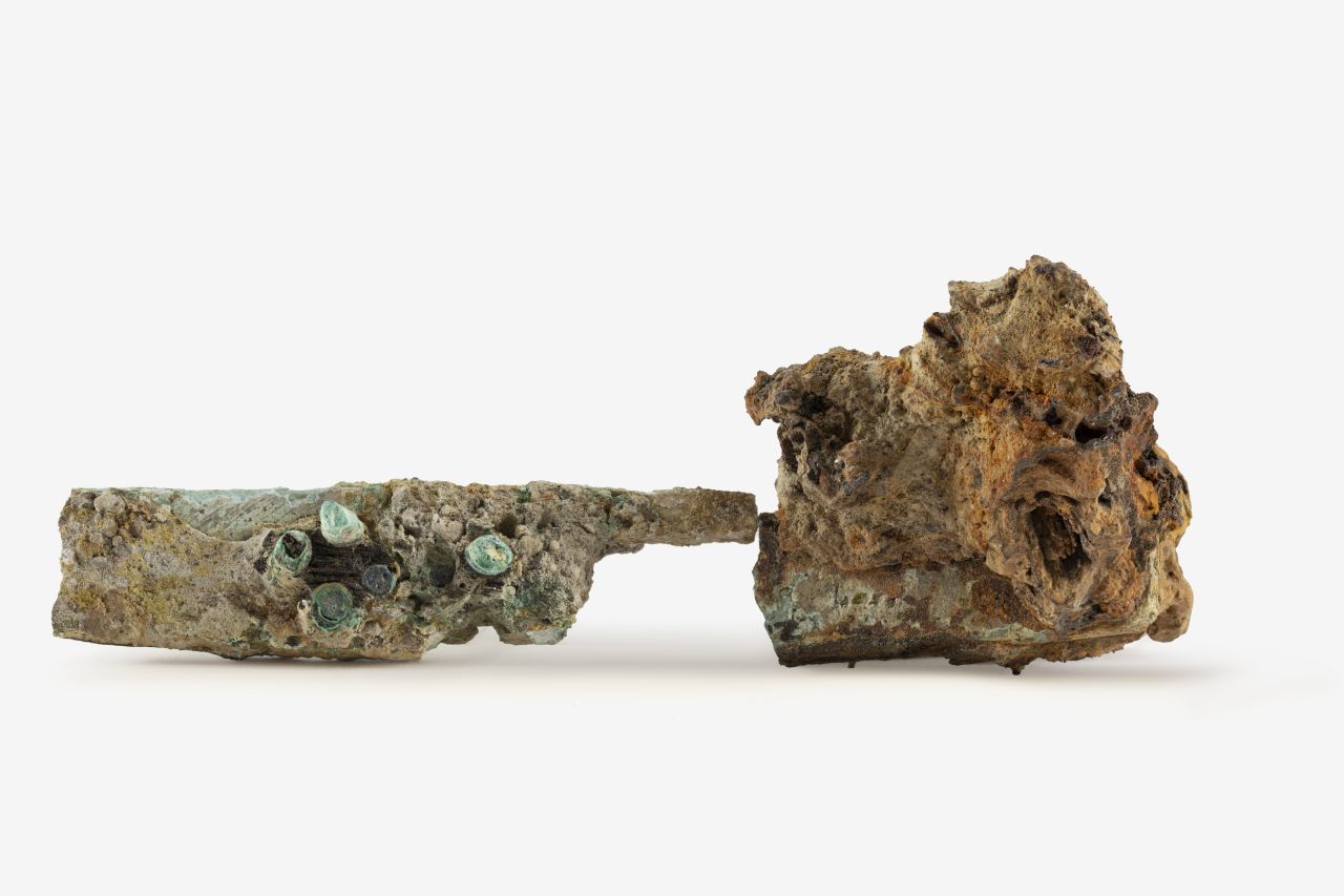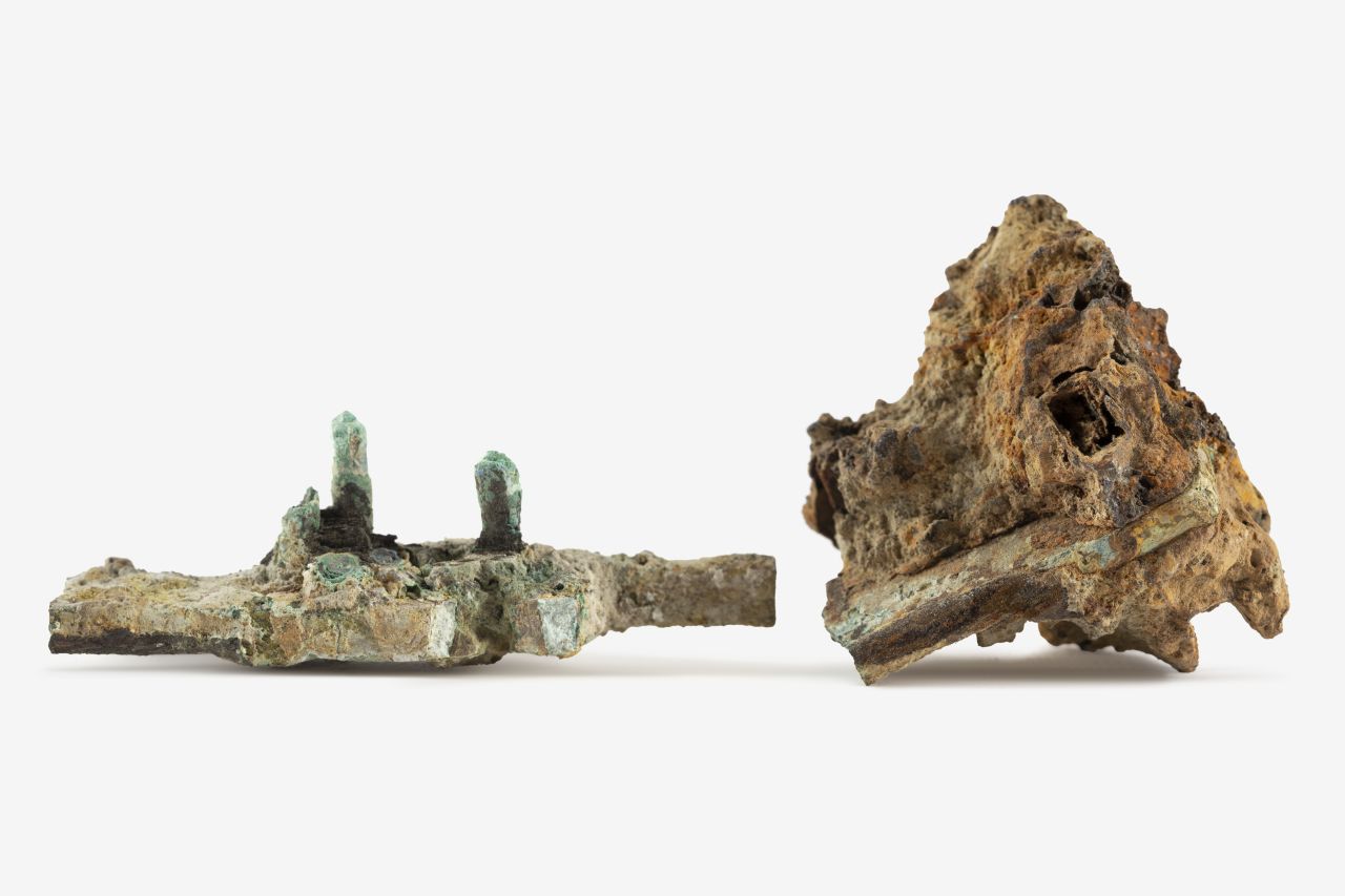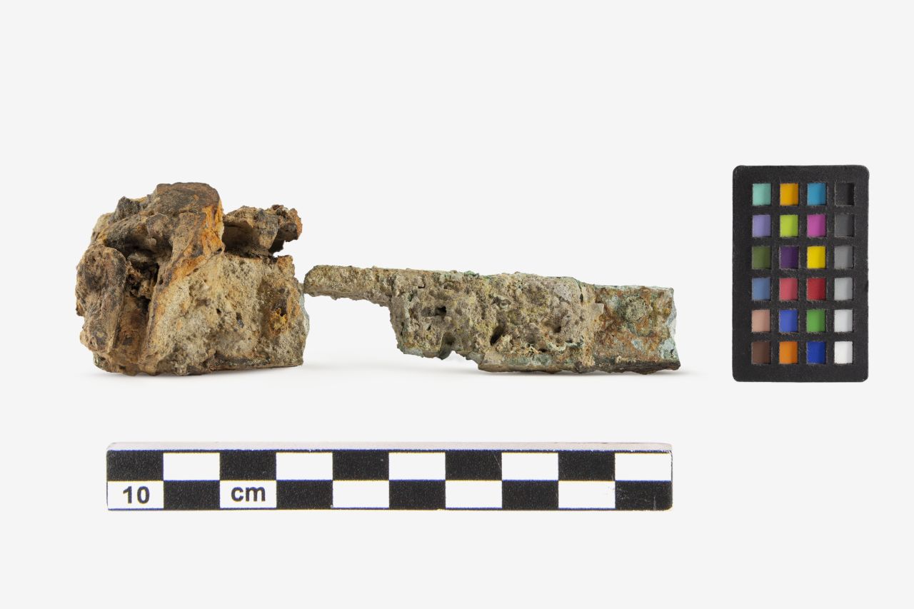 gruppo concrezionato pertinente ad una serratura di cui si legge un chiavistello a placca rettangolare piena con piastra a croce e lungo perno di fissaggio a sezione rettangolare