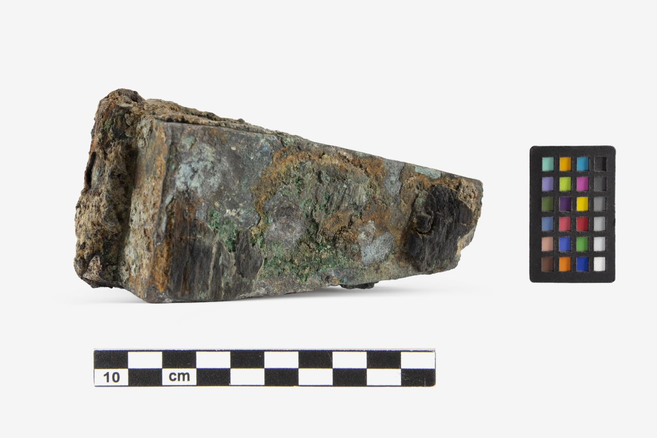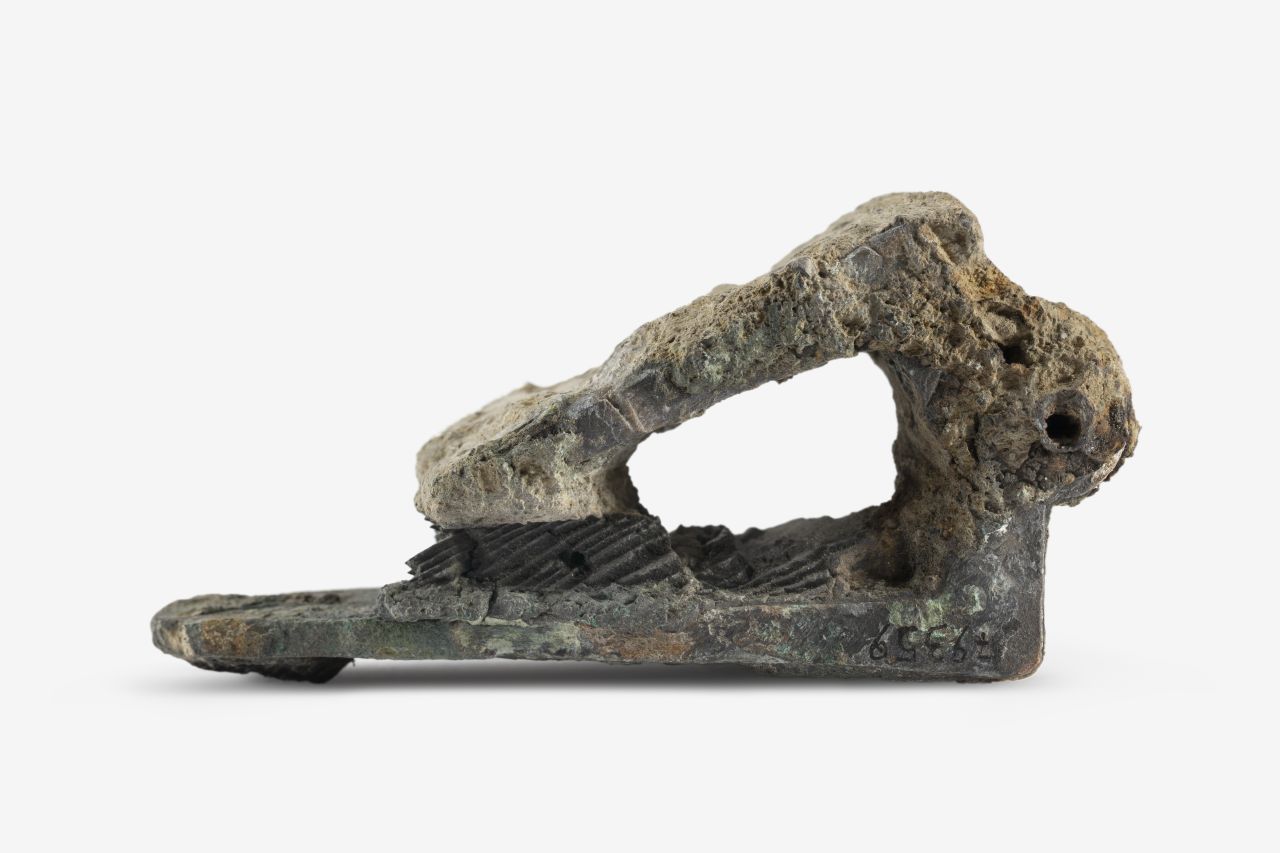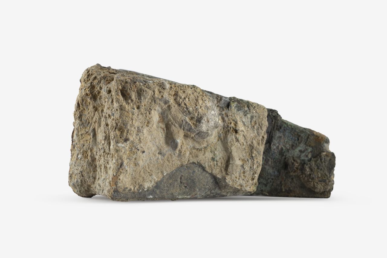 Cardine a forma di lunga placca trapezoidale a margine interno ripiegato ad L, cerniera a quattro larghi anelli cilindrici che conservano ancora piccole tracce del tubolare in ferro. Le placche, interamente concrezionate, sono da ricondurre al tipo con lati profilati e foro di innesto per i chiodi