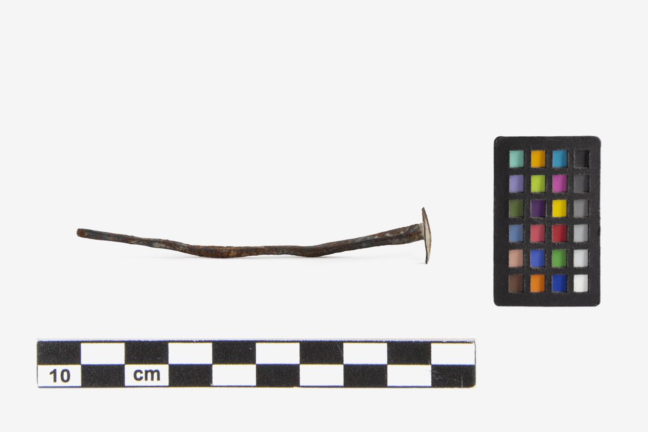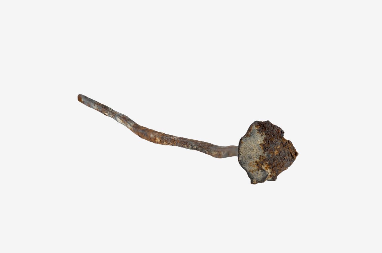 Chiodo in ferro con testa a sezione circolare e gambo a sezione quadrata rastremato verso la punta