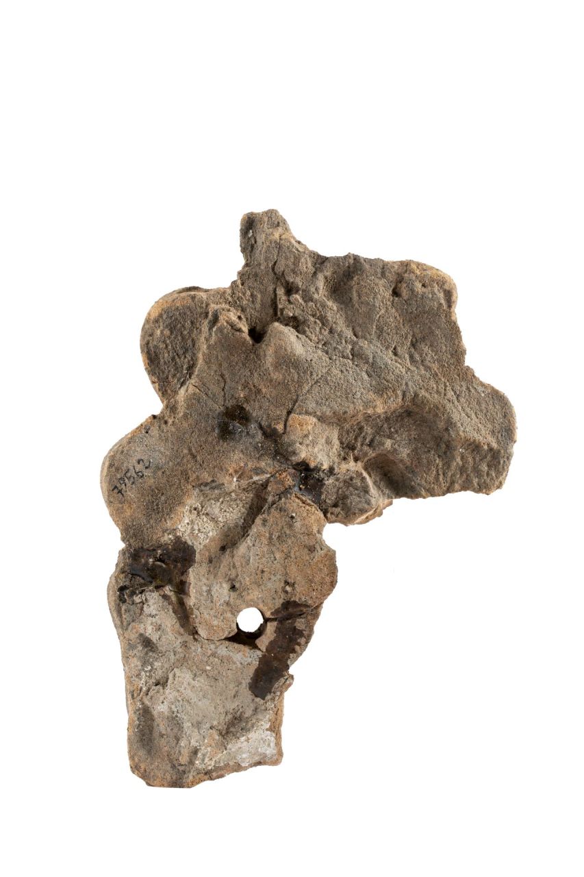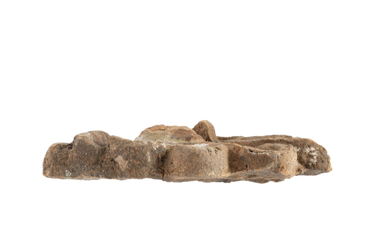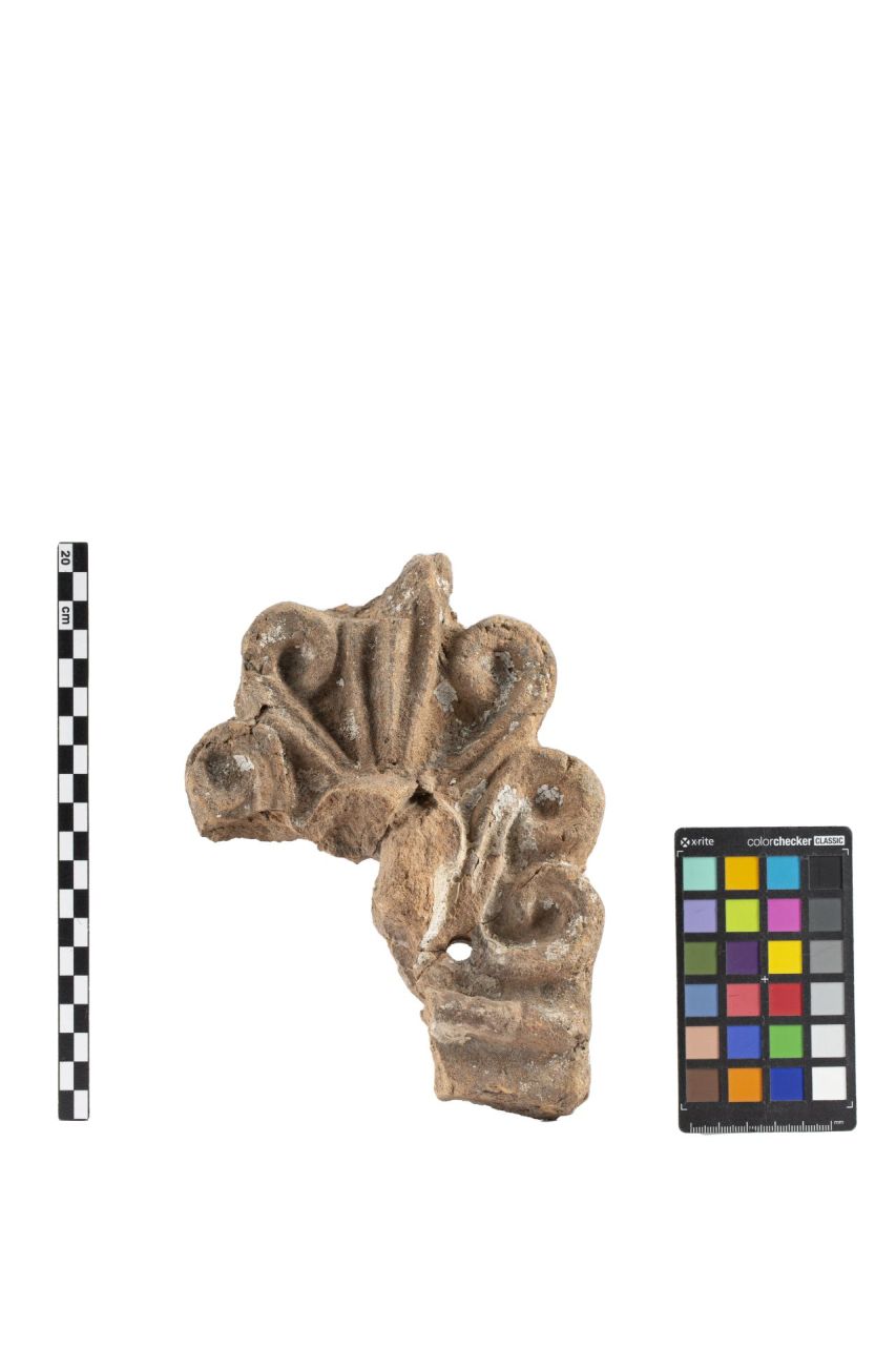Antefissa a testa femminile (qui assente) tra elementi vegetali e listello di base liscio, che conserva, nella parte posteriore, tracce dell'attacco del coppo. Tracce di ingobbiatura bianca