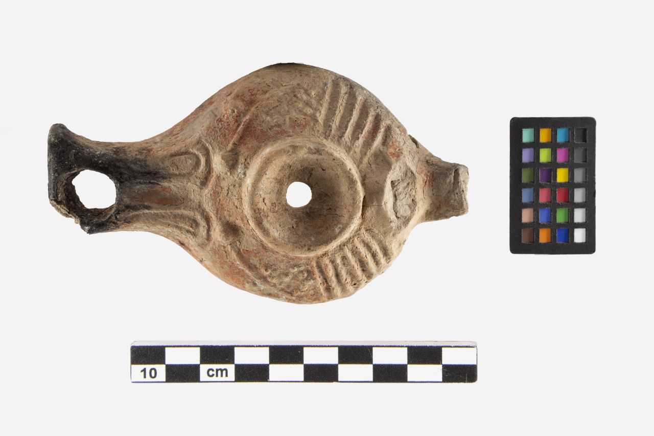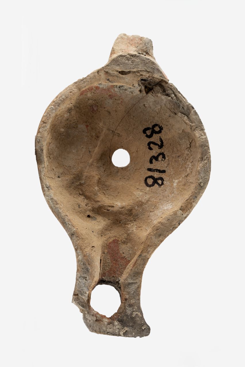 Frammento di lucerna di cui si conserva soltanto la valva superiore. Ampia spalla sensibilmente obliqua, piccolo disco depresso, definito da un alto bordo, piccolo infundibulum centrale. Becco allungato ad incudine. Ansa a nastro impostata orizzontalmente sulla spalla. Corpo ceramico di colore beige, vernice rossastra