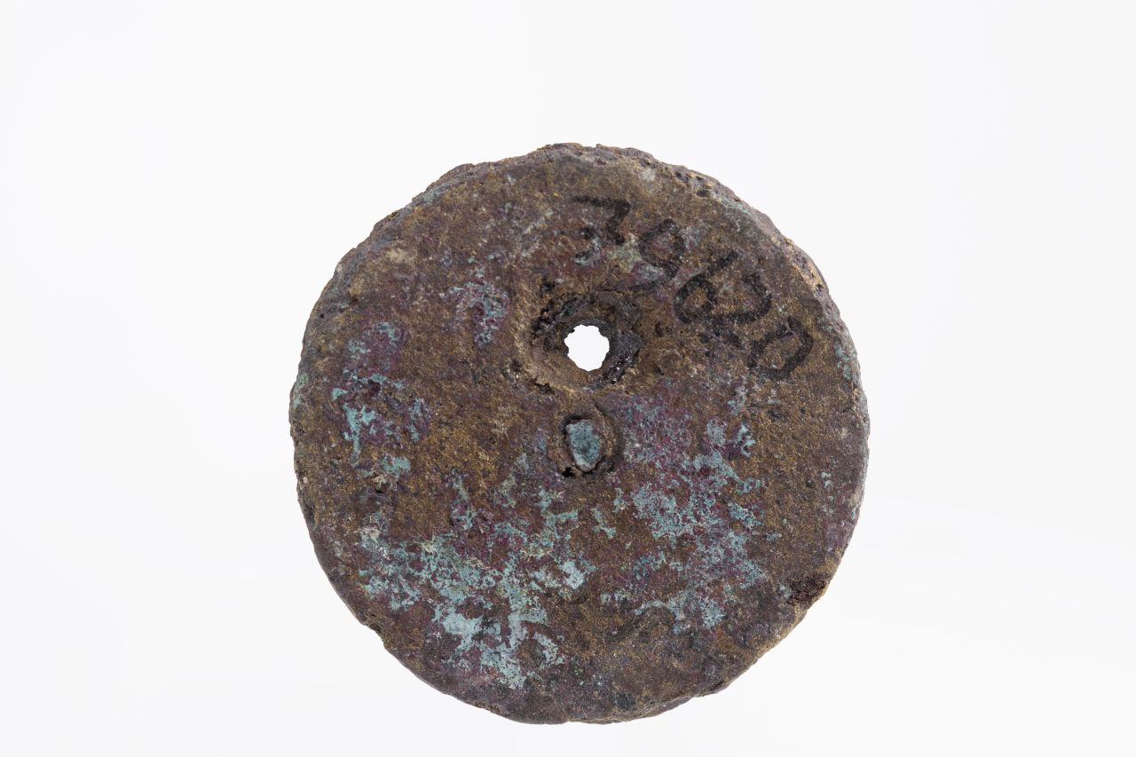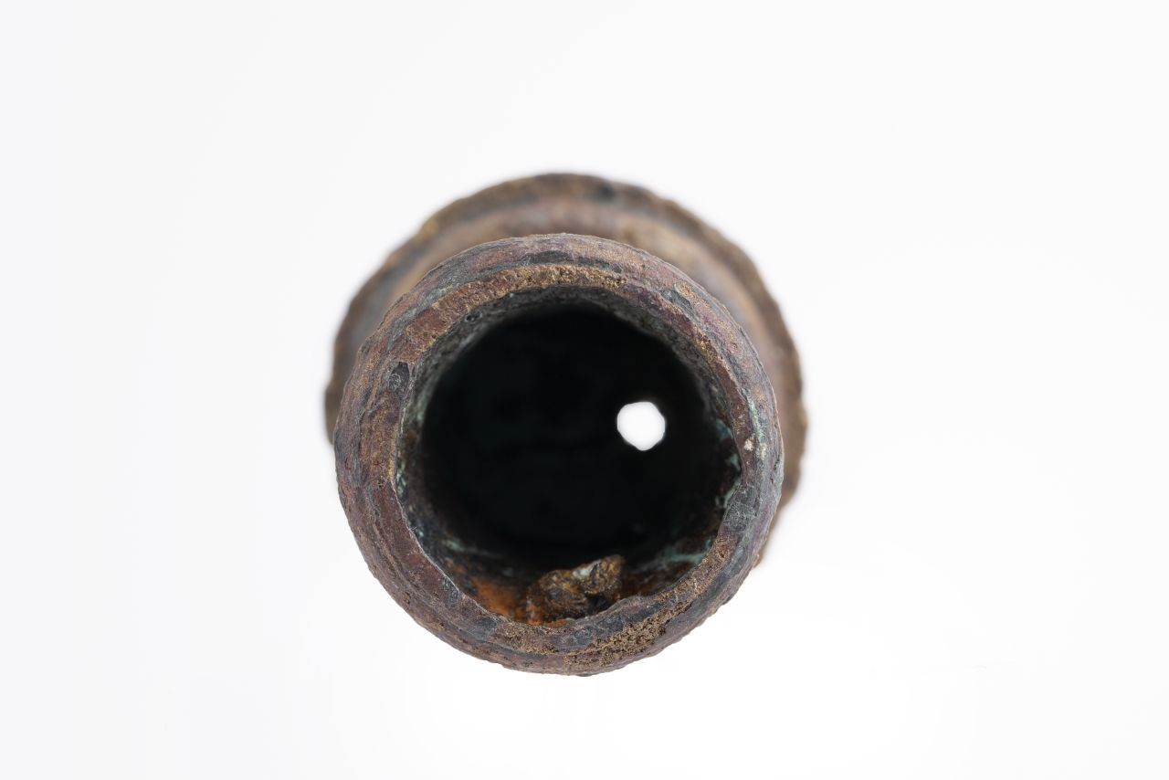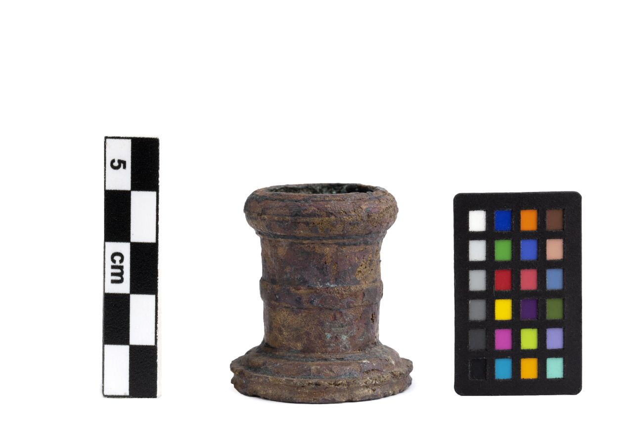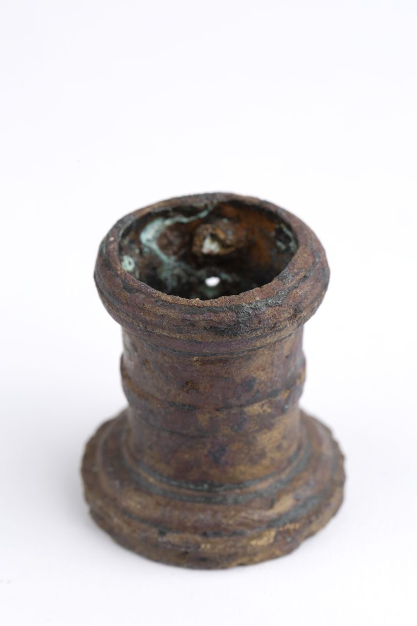 Piede di mobile a forma di cilindretto sagomato, cavo all'interno. Alla base è un foro di piccole dimensioni con tracce del perno di bronzo