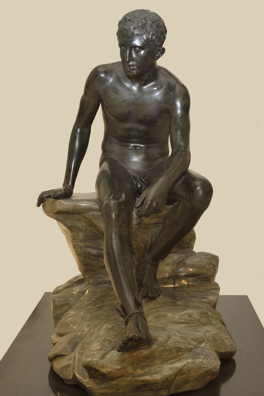 Statua maschile di dimensioni leggermente inferiori al vero, montata su una base moderna in marmo grigio a forma di roccia; la statua è stata fusa in sei parti separate