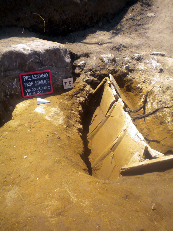 - INTERPRETAZIONE Sulla base della tipologia delle tombe e dei frammenti ceramici recuperati è possibile collocare le sepolture in un arco cronologico compreso tra il I a.C. ed il I d.C. Presumibilmente si tratta di una piccola area di necropoli pertinente ad una villa rustica non ancora identificata, ma presente in zona come sembra confermare il ritrovamento di una notevole quantità di ceramica comune e da cucina