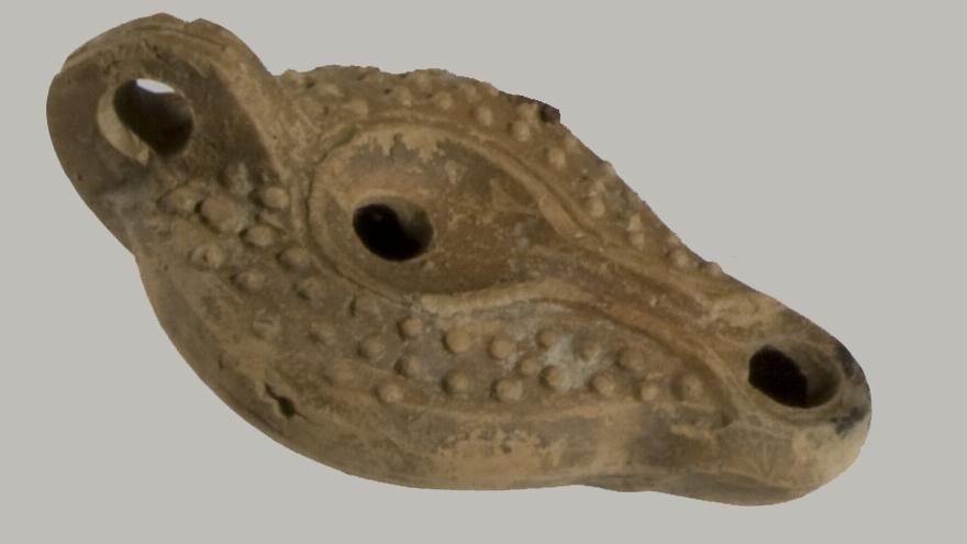 Lucerna a perline.corpo allungato e schiacciato,spalla leggermente obliqua decorata con triplice fila di perline a rilievo;disco-canale depresso con infundibulum centrale definito da un bordo rilevato che continua fino alla base del becco con foro di sfiato alla base;fondo piano,ansa ad anello impostata sulla spalla segnata da un solco irregolare. Tipo Fabbricotti II B