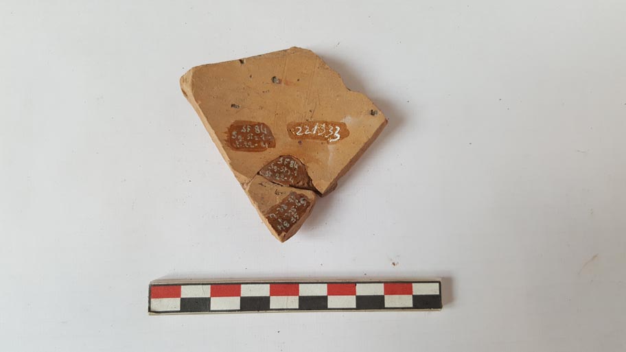 Frammento di recipiente in argilla depurata, nocciola, con rari piccoli, inclusi neri, decorazione in vernice bruna: serie di tratti orizzontali consecutivi tra due sottili linee continue