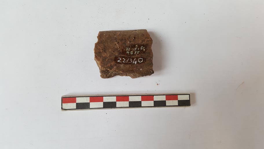 Frammento di labbro di recipiente di notevoli dimensioni in impasto grezzo bruno rossiccio. Labbro indistinto terminate in un orlo ornato da una fila di embricature ottenute a incisione