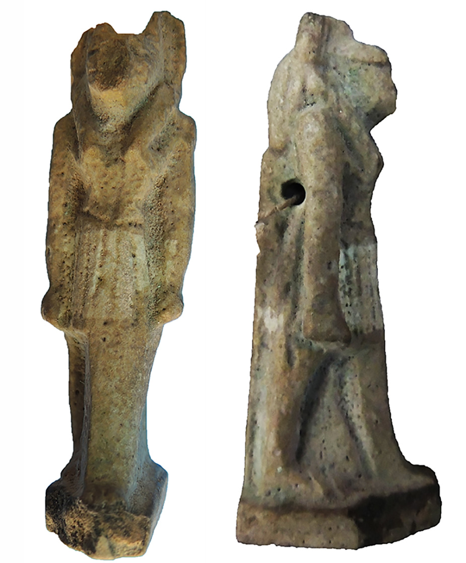 Amuleto rappresentante il dio Anubi con corpo umano e testa di sciacallo, su base rettangolare, sorretto posteriormente da un pilastro dorsale liscio attraversato da un foro trasversale per la sospensione all'altezza dei gomiti