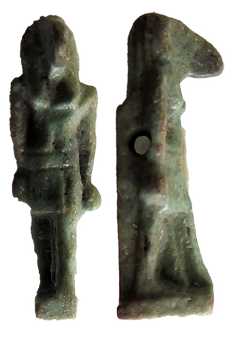 Amuleto in forma di divinità stante su base parallelepipeda e con pilastro dorsale che giunge fino alla fine della parrucca, attraversato da un foro trasversale per la sospensione all'altezza dei gomiti