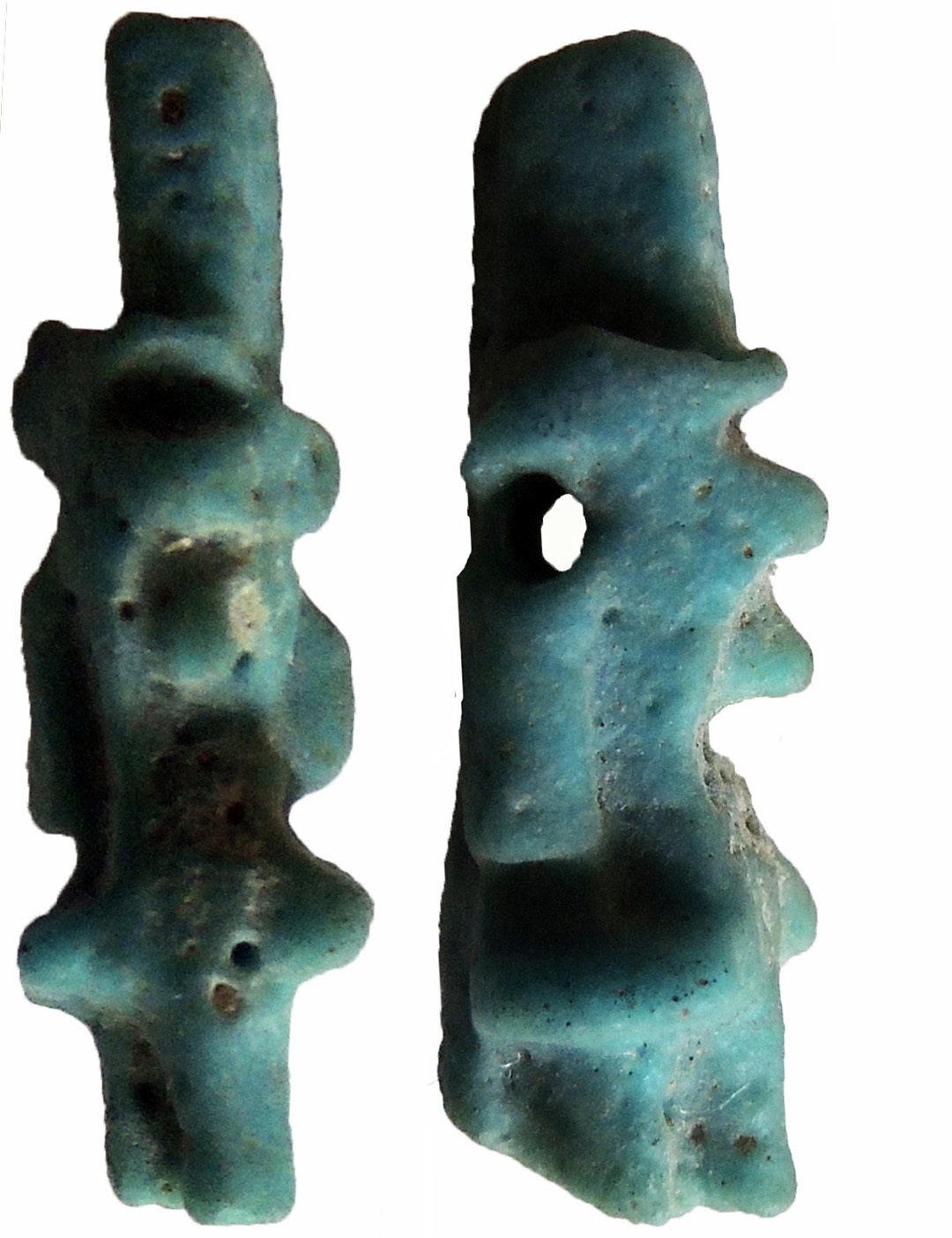 Amuleto antropomorfo , con sottile pilastro dorsale e foro trasversale per la sospensione all'altezza della cervice
