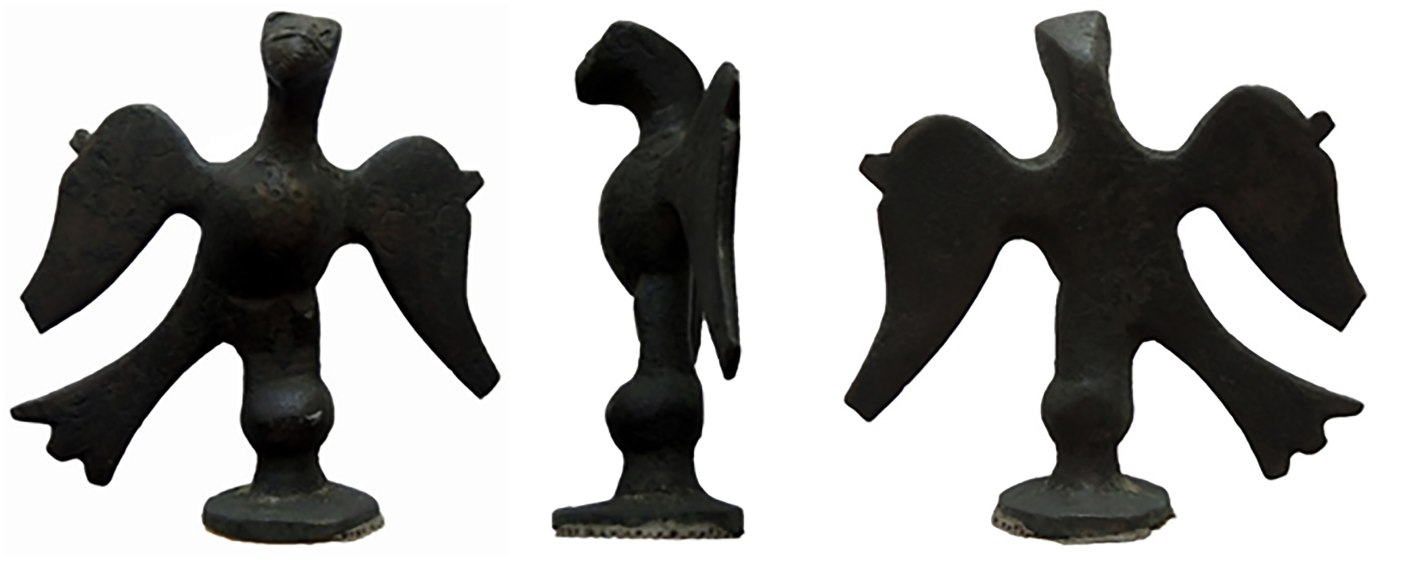 Aquila su piedistallo con base circolare e sfera su cui poggiano le zampe dell'uccello, unite e rese in modo molto schematico