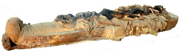 Alveo di sarcofago antropoide con mummia parzialmente sbendata,