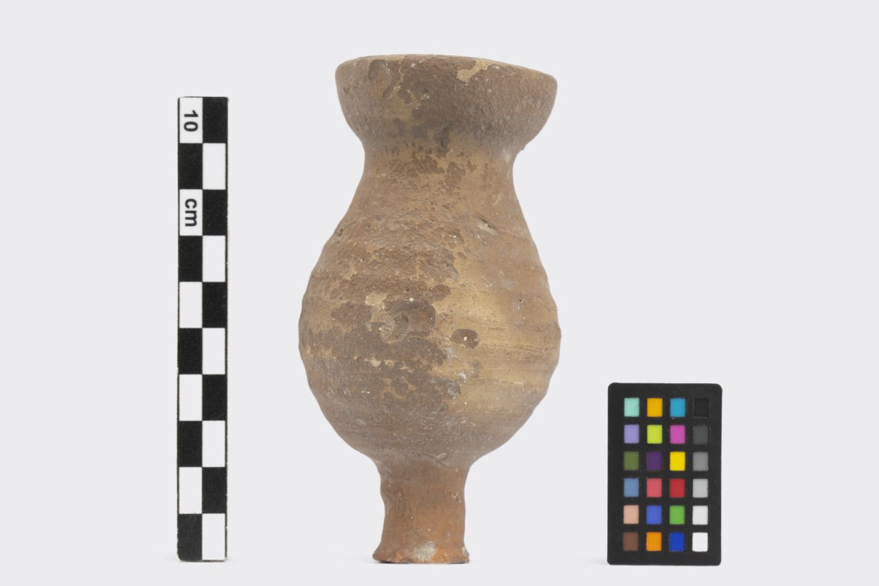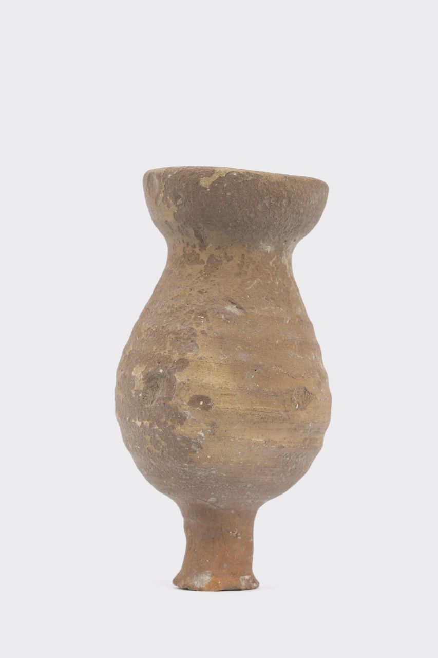 Orlo a fascia convessa, corpo ovoide allungato con solcature a spirale del tornio, piccolo piede tronco-cilindrico