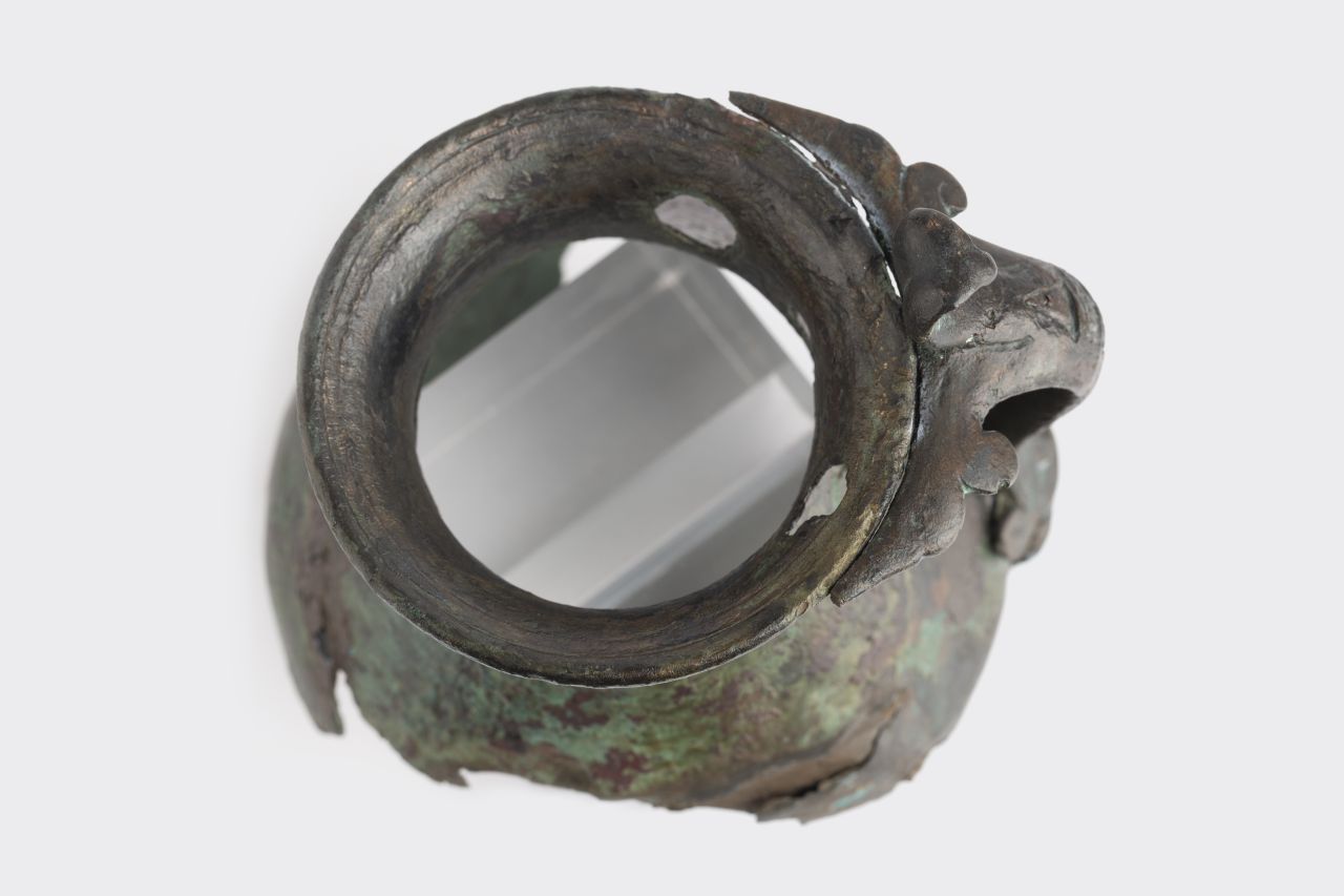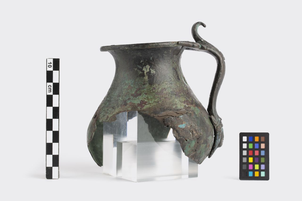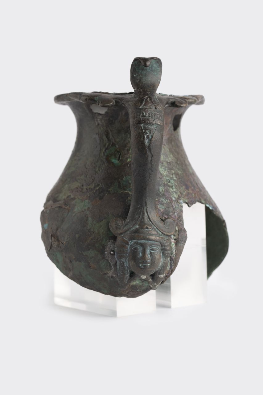- NOTIZIE STORICO CRITICHE Probabilmente parte del servizio da mensa, questa tipologia di brocchetta, inorigine monoansata, afferisce alla serie B 1261 b della classificazione dellaTassinari, contraddistinto dal ventre basso e bulbiforme e da un collo piuttosto strozzato. Il tipo compare di frequente, pur con varianti, tra il vasellamebronzeo di area vesuviana durante il I secolo d.C. Il repertorio figurativo espresso dall'ansa della brocca rivela una tendenza spesso attestata nella decorazione delle anse del vasellame bronzeo: quella della rappresentazione di motivi bacchici e in particolare della maschera di menade, perfettamente corrispondente alla tipica iconografia sviluppatasi a partire dall'età ellenistica