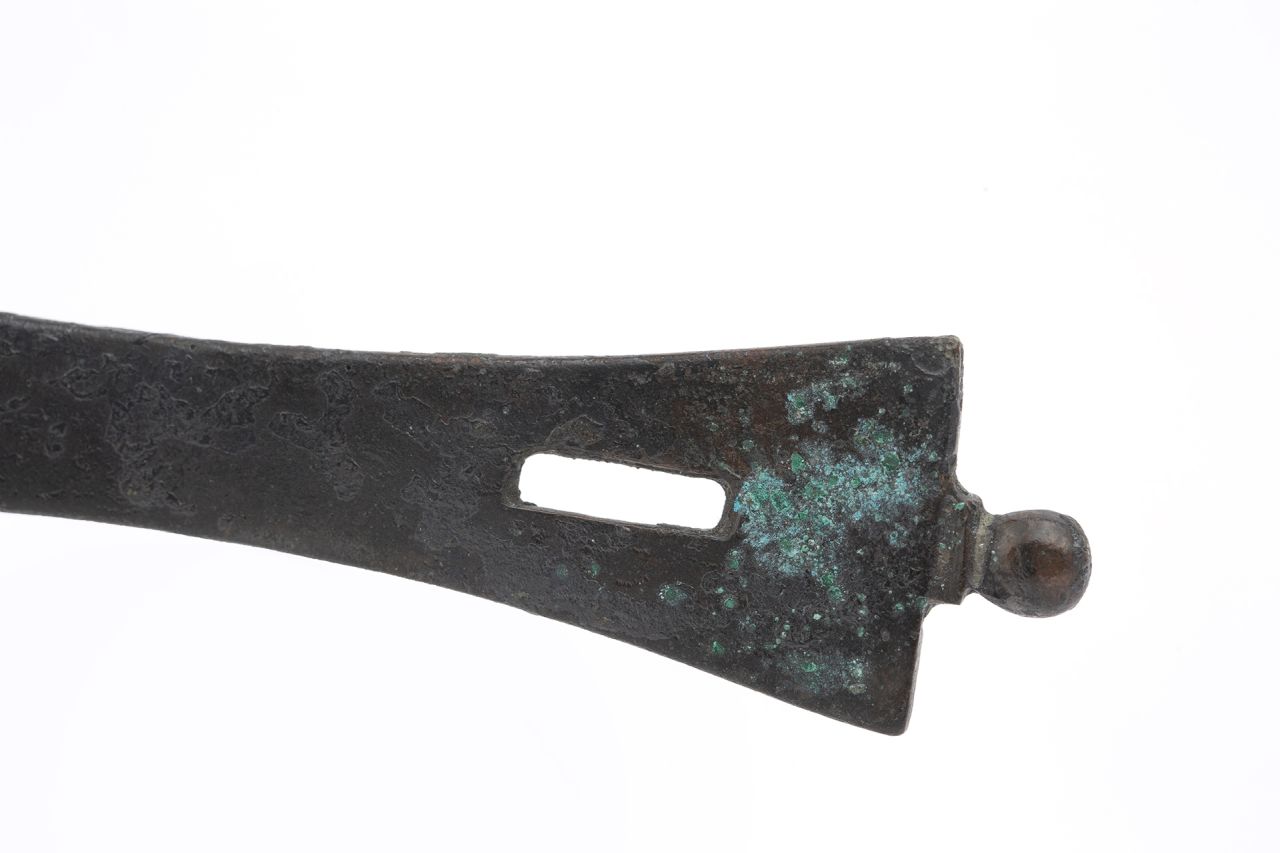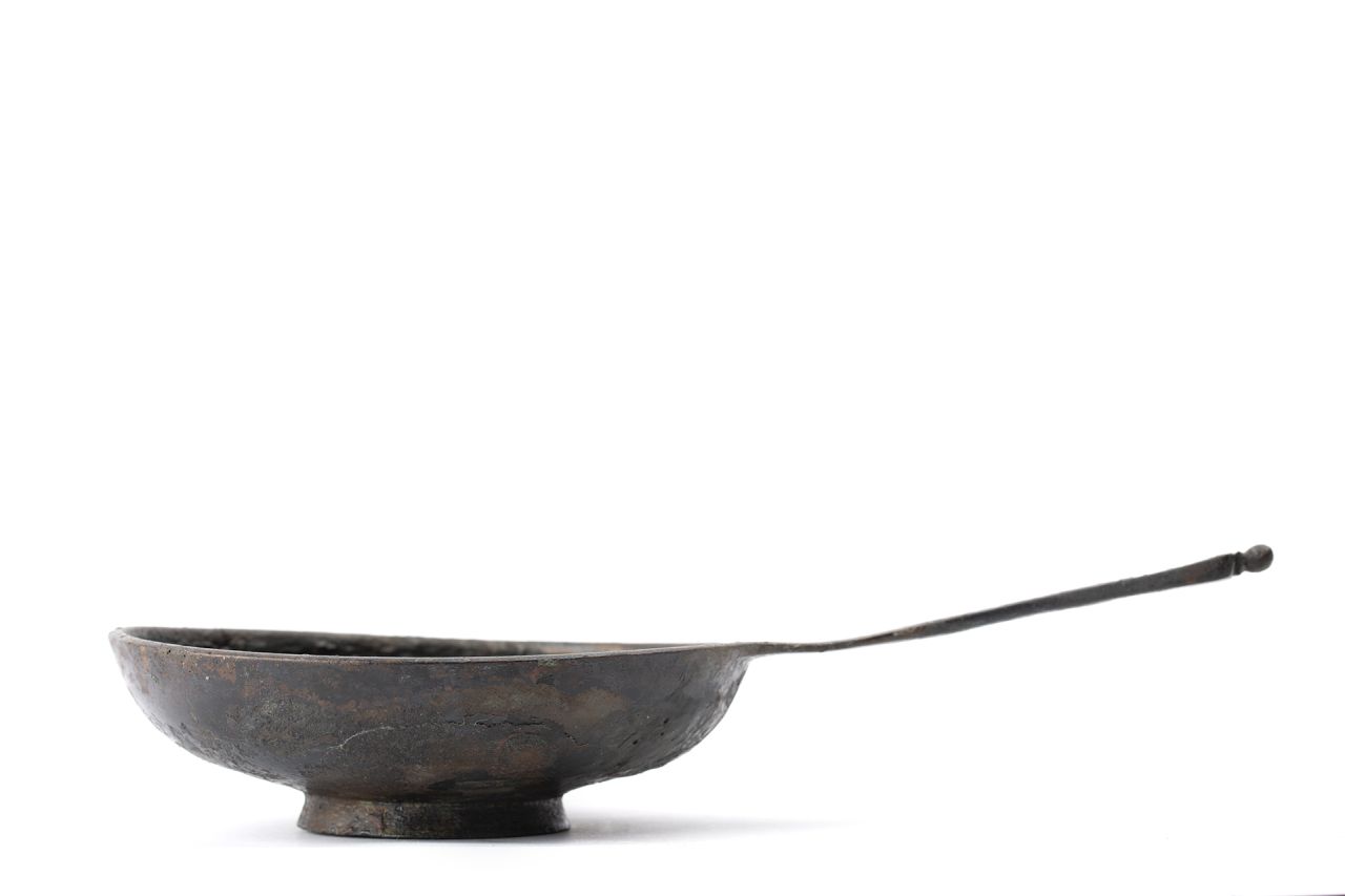 Bassa vasca emisferica con orlo ingrossato e arrotondato verso l'interno; manico a nastro orizzontale con estremità rettilinea, recante un foro allungato; piede ad anello con listelli concentrici sul fondo esterno