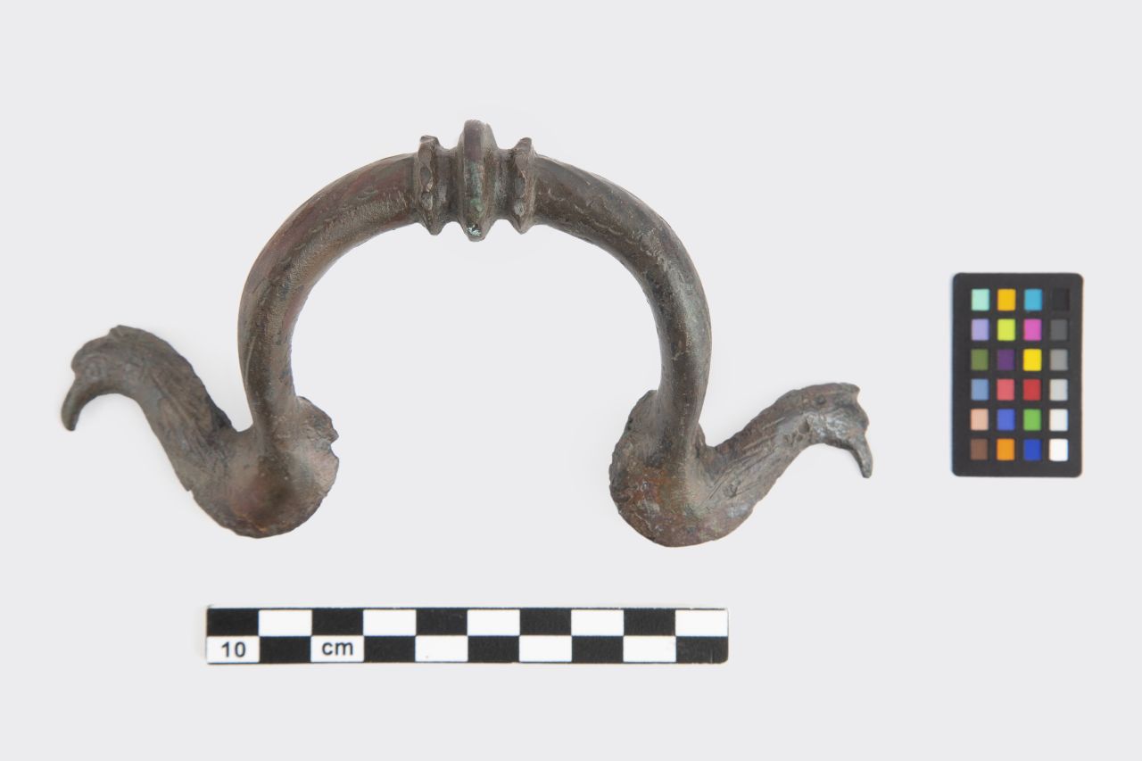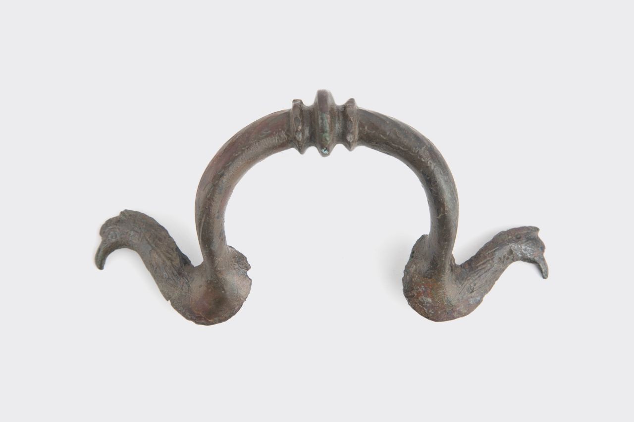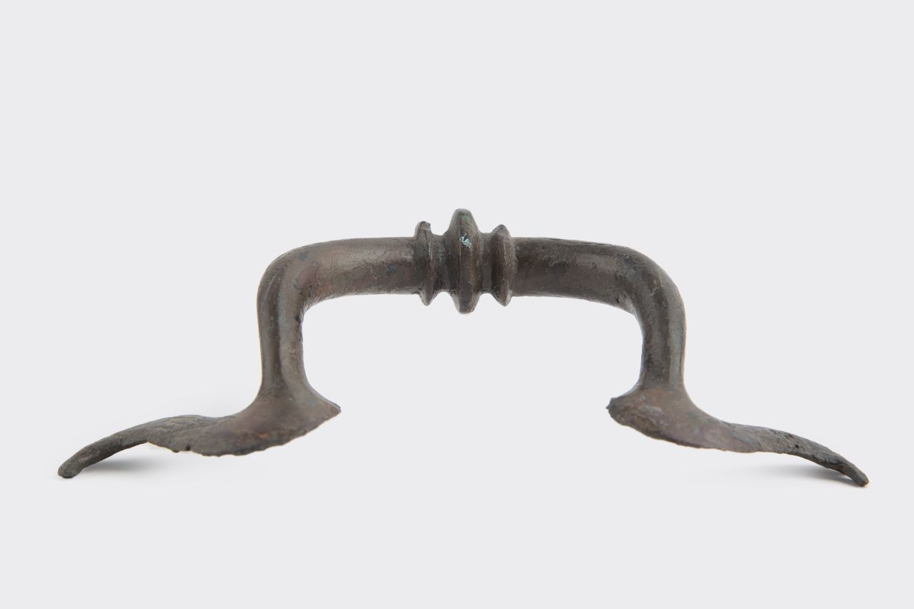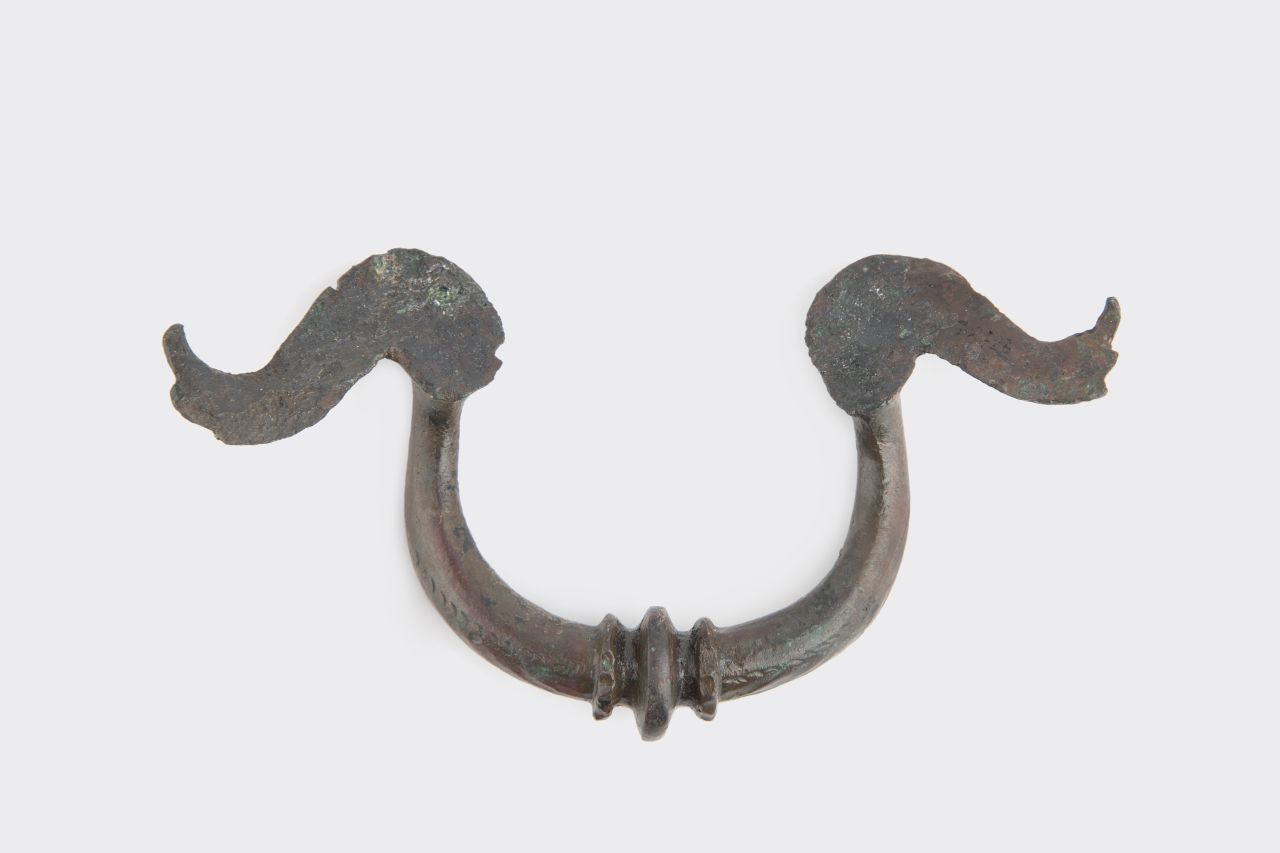 Ansa con fusto ad omega originariamente saldata a circa due terzi dell’altezza del bacile