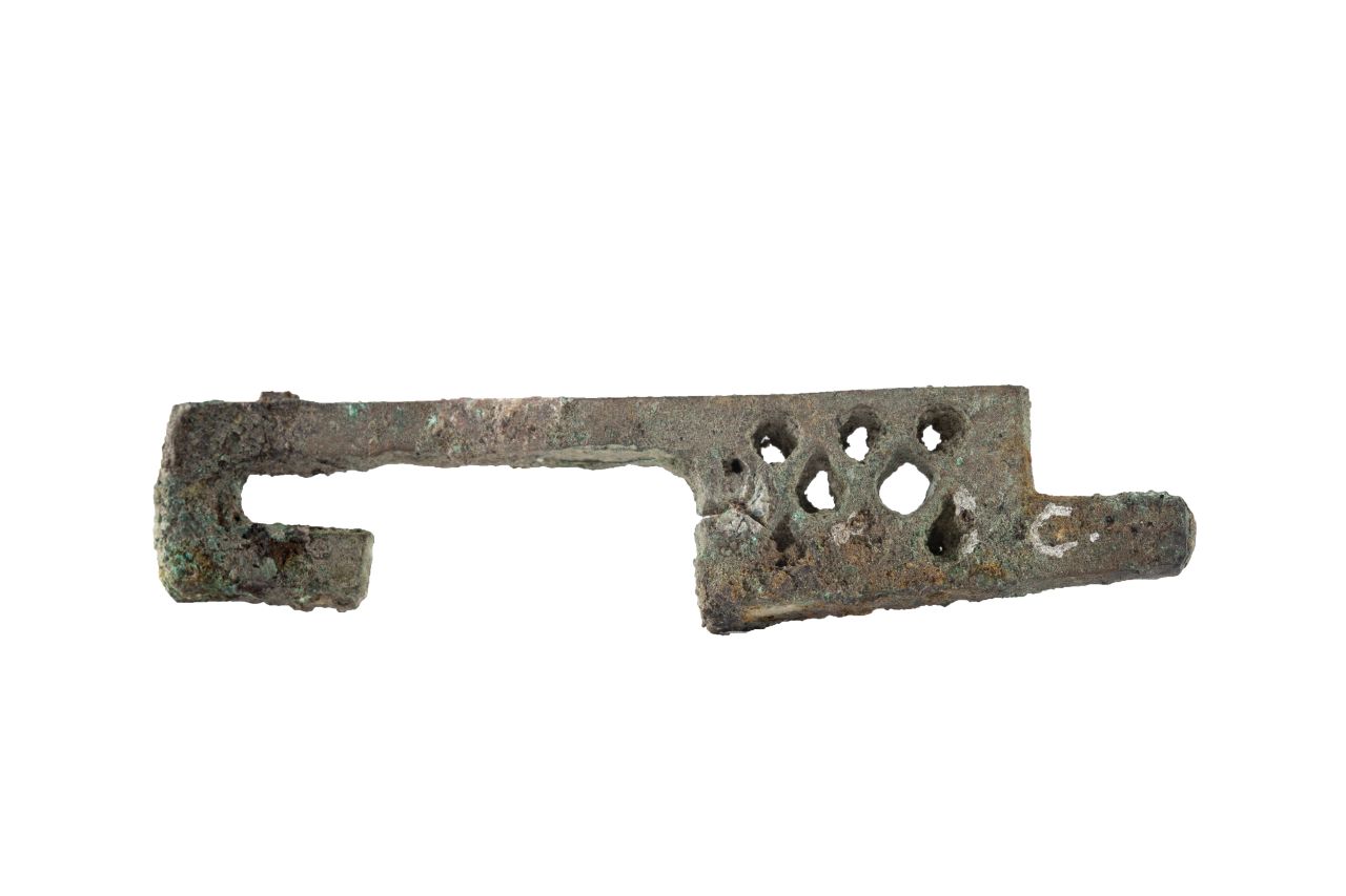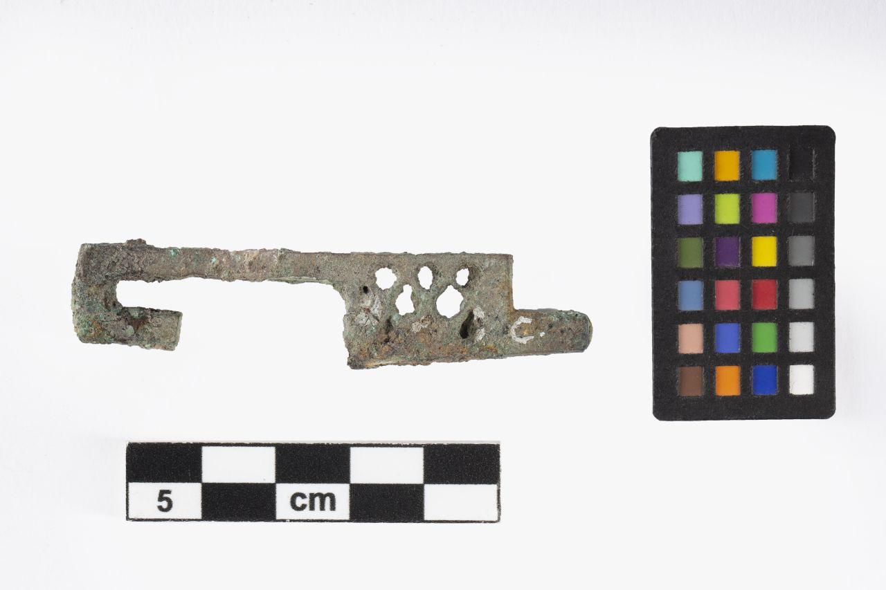 Placca piena a sezione rettangolare con otto fori circolari; lungo perno a sezione rettangolare con parte terminale ad U