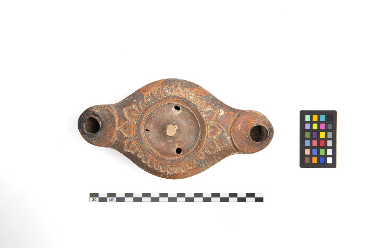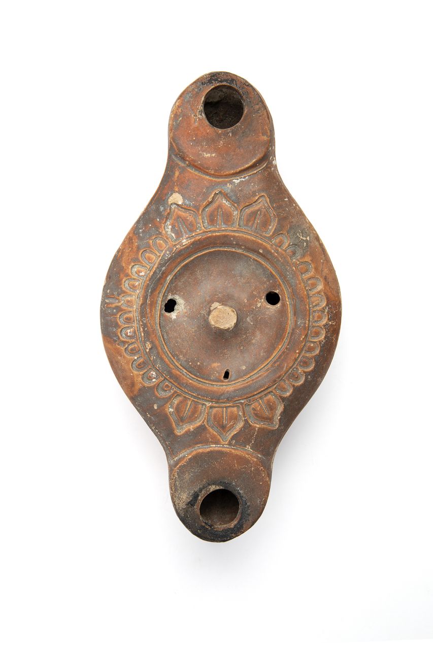 Lucerna bilicne a becchi contrapposti dal corpo discoidale allungato verso i due becchi. Spalla ampia leggermente discendente verso l'esterno, separata dal disco da un bordo rilevato e da una scanalatura. Un'ansa su pilastrino si eleva al centro del disco circolare depresso, che ospita due fori di alimentazione e un forellino di sfiato. I due grossi becchi presentano una terminazione ogivale delimitata superiormente da una solcatura ricurva. Il fondo a mandorla, segnato da una scanalatura della stessa forma, presenta il punto di centratura indicato da doppio cerchiello inciso. Corpo ceramico di colore arancio-rosato chiaro, vernice rosso-bruno, metallescente