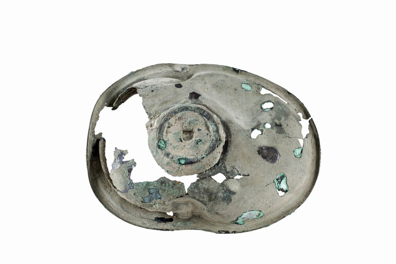 Vaso a paniere in bronzo. Ventre basso e ampio, asimmetrico e svasato, con apertura bilobata. Piccola spalla sulla parete posteriore, e parete convessa e liscia nella parte anteriore. Labbro estroflesso ed orlo pendulo. Base discontinua con piede ad anello