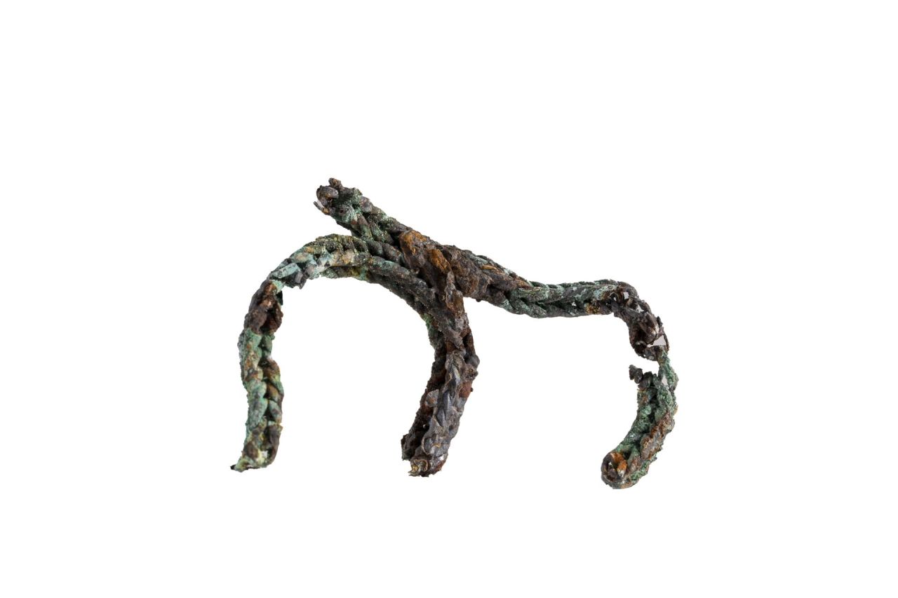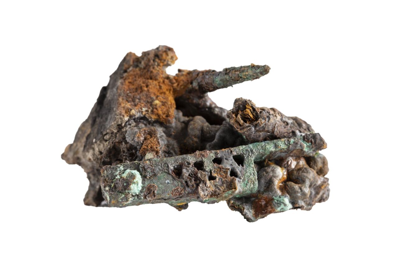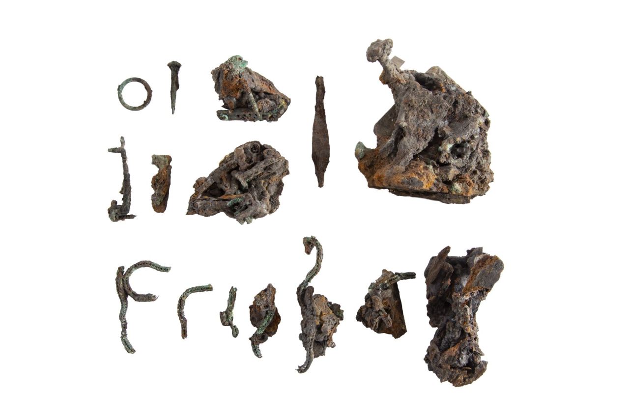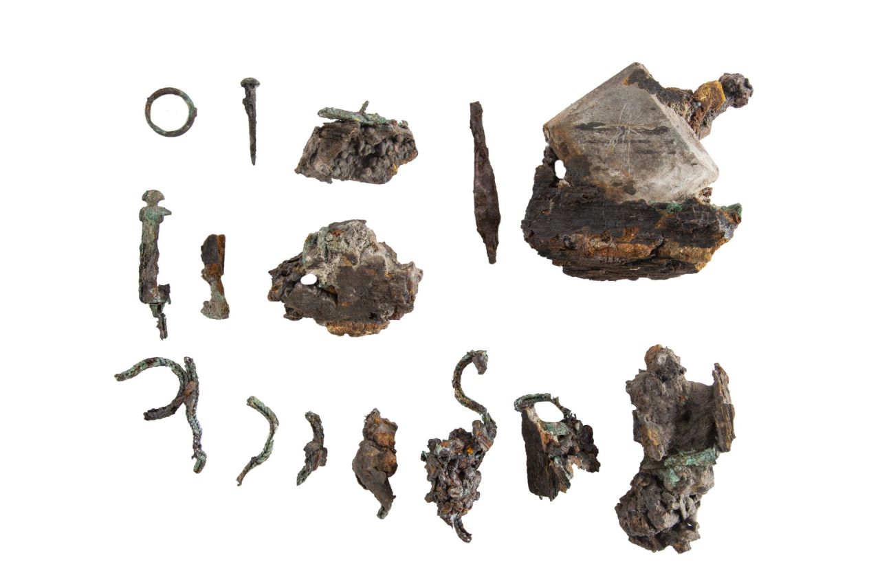 Vari grovigli inglobanti numerosi elementi in bronzo e in ferro, tra i quali si distinguono frammenti di catenelle, chiodi in bronzo di media lunghezza con capocchia a calotta e gambo a sezione quadrangolare, placchette con frammenti di legno, anello in bronzo, chiodi in ferro, un chiavistello con placca rettangolare piena e piastra con sette fori di forma triangolare. Inoltre, sono presenti numerosi elementi di ferramenta di dubbia identificazione e frammenti di legno combusto di medie e piccole dimensioni