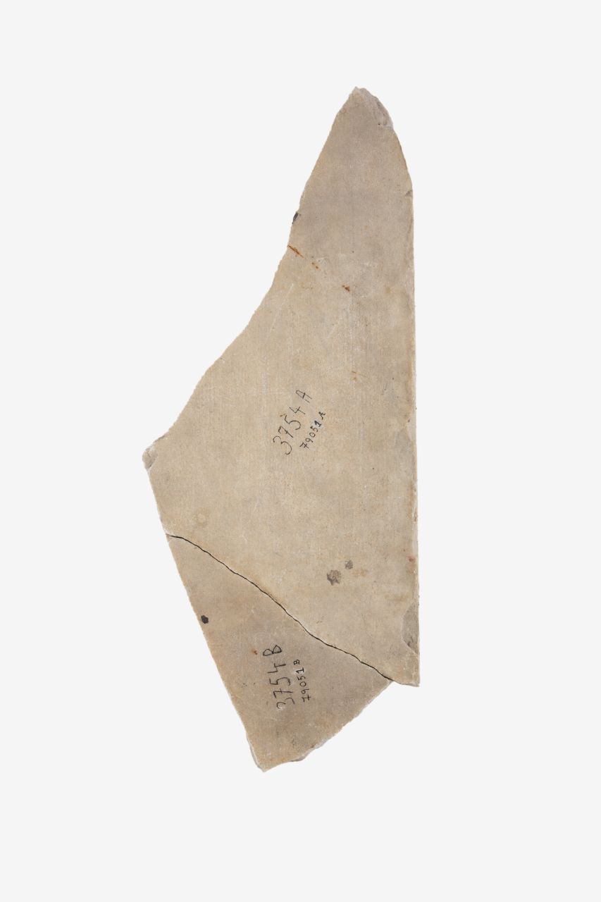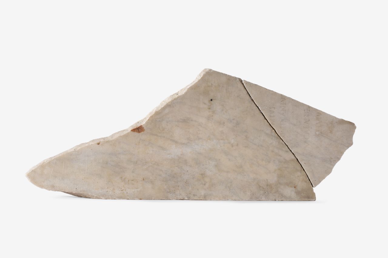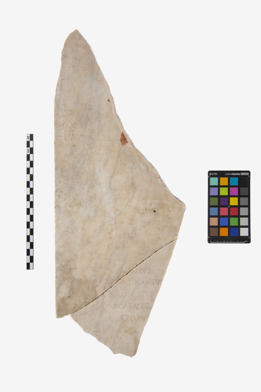 Frammento di lastra di marmo, fratta superiormente ed inferiormente, di forma irregolare, con iscrizione dipinta di cui si distinguono solo poche righe di una colonna