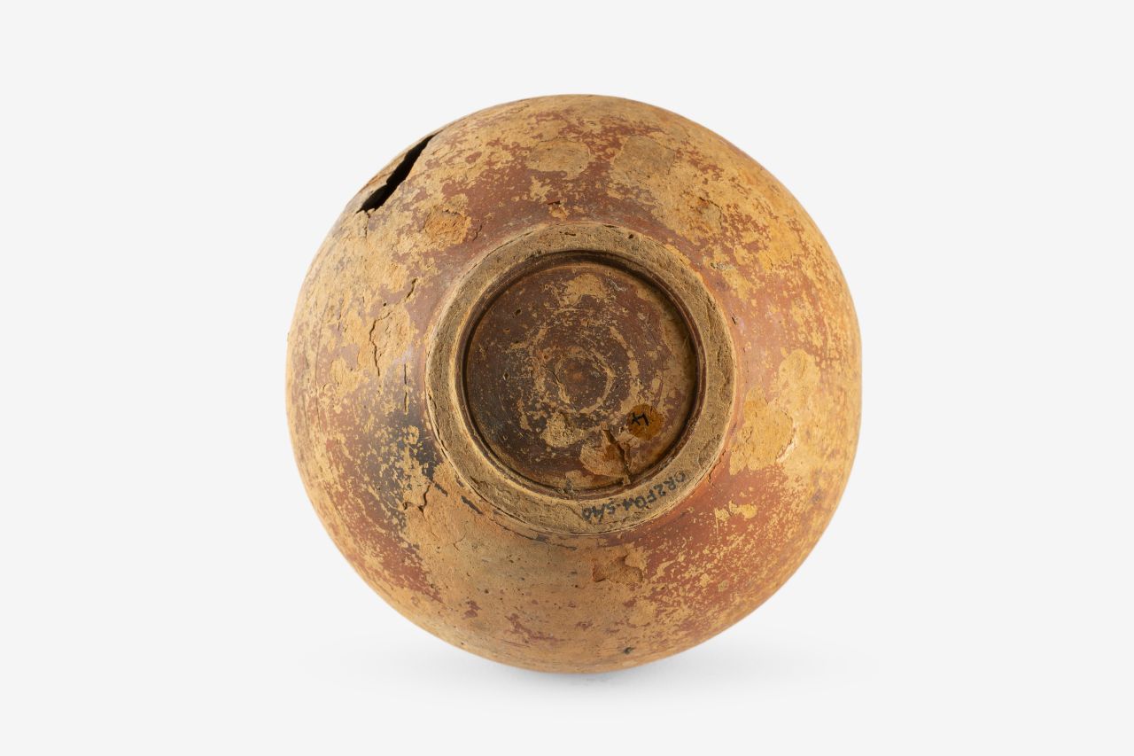 orlo assottigliato, labbro circolare, a disco, breve collo cilindrico, spalla arrotondata, corpo globulare con ventre arrotondato, piede ad anello, a sezione triangolare. Ansa verticale, a nastro, scanalata, impostata sotto l’orlo e sulla spalla, leggermente angolata. Vernice rossiccia
