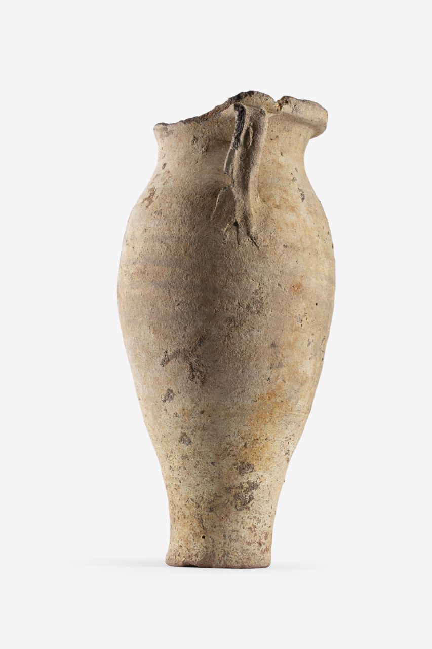 Orlo verticale, a fascia, concavo internamente, collo brevissimo, corpo leggermente globulare affusolato verso il fondo, piatto e profilato. Anse verticali,a nastro, scanalate impostate sul collo e sul corpo