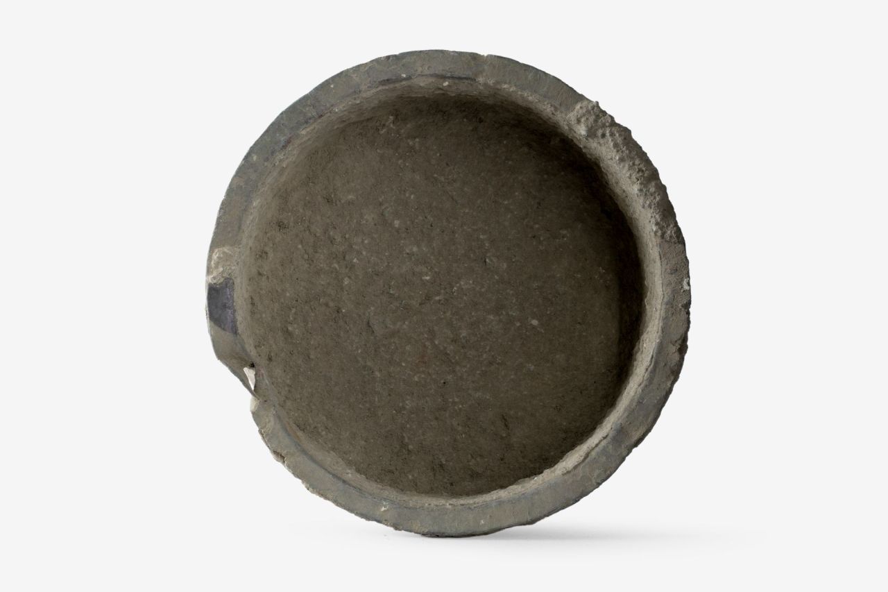 Orlo leggermente ingrossato e arrotondato, vasca profonda, cilindrica, a pareti verticali, fondo piano. Sull'orlo, traccia di una appendice di presa (?)