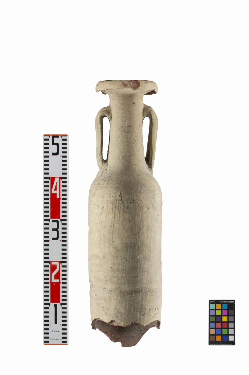 Orlo svasato, ripiegato, pendente, scanalato all’estremità, su collo dal profilo leggermente inflesso, spalla arrotondata, alto corpo cilindrico con terminazione a puntale. Le anse, impostate sulla parte alta del collo e sulla spalla, sono a sezione ovale e dal gomito arrotondato
