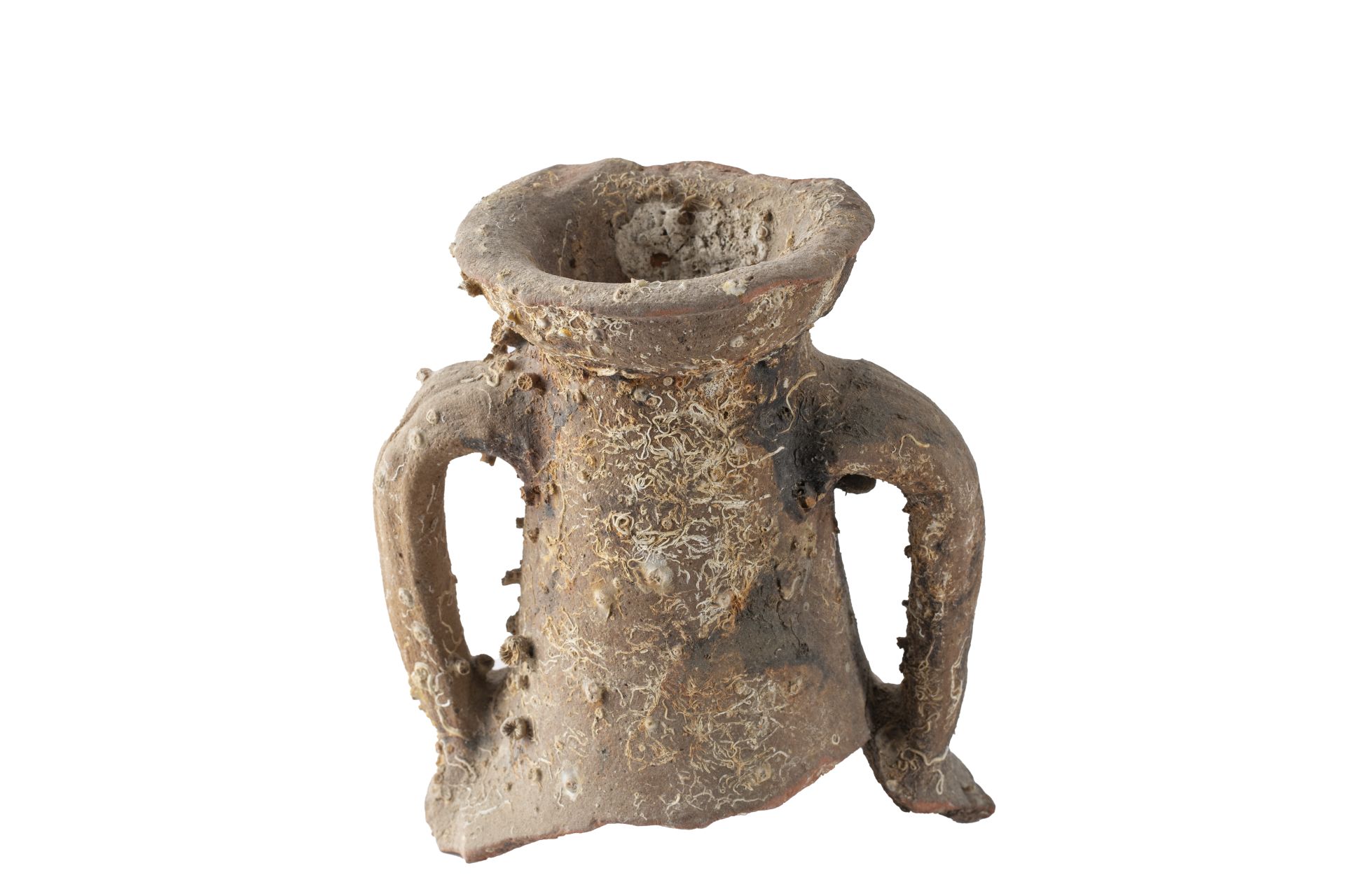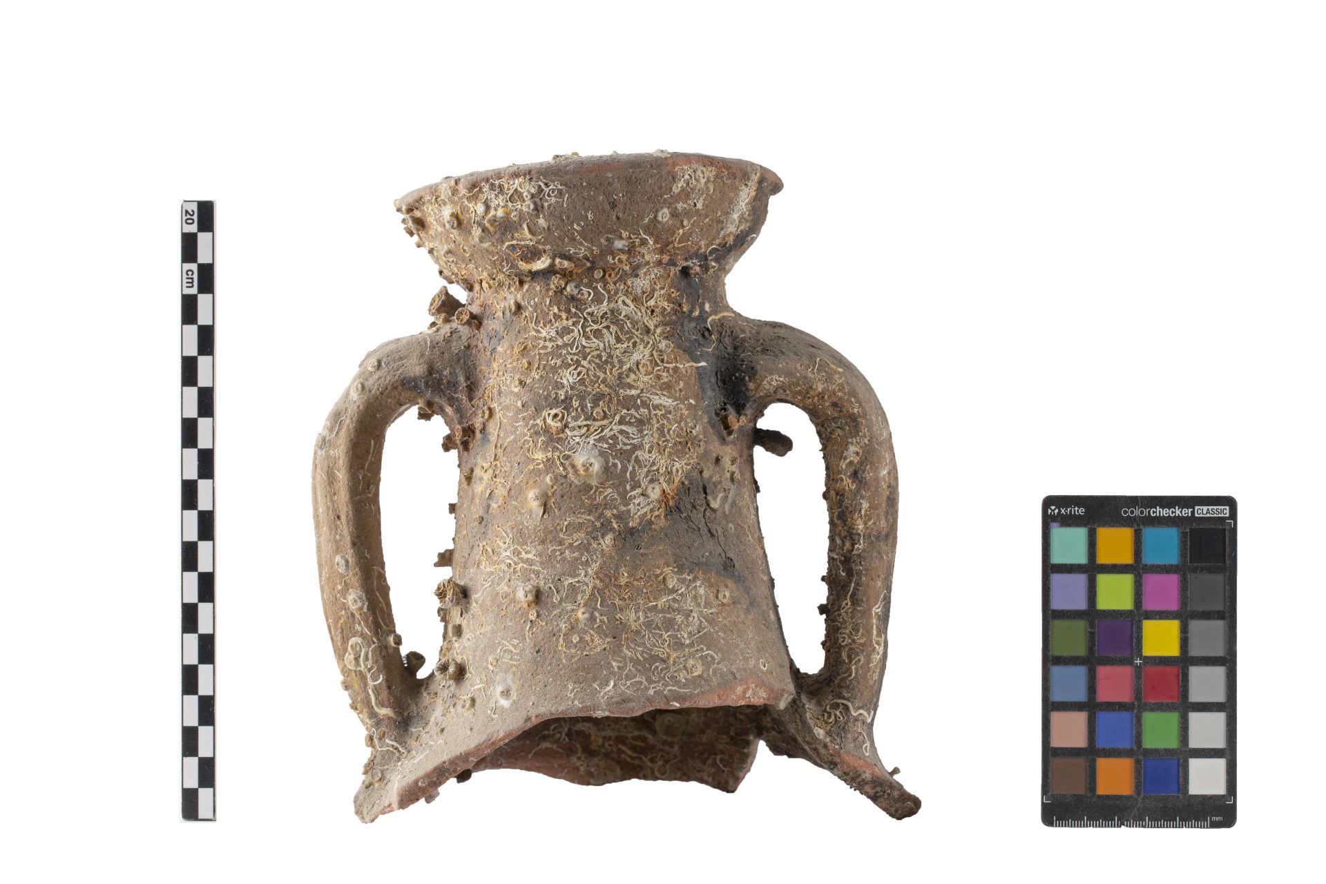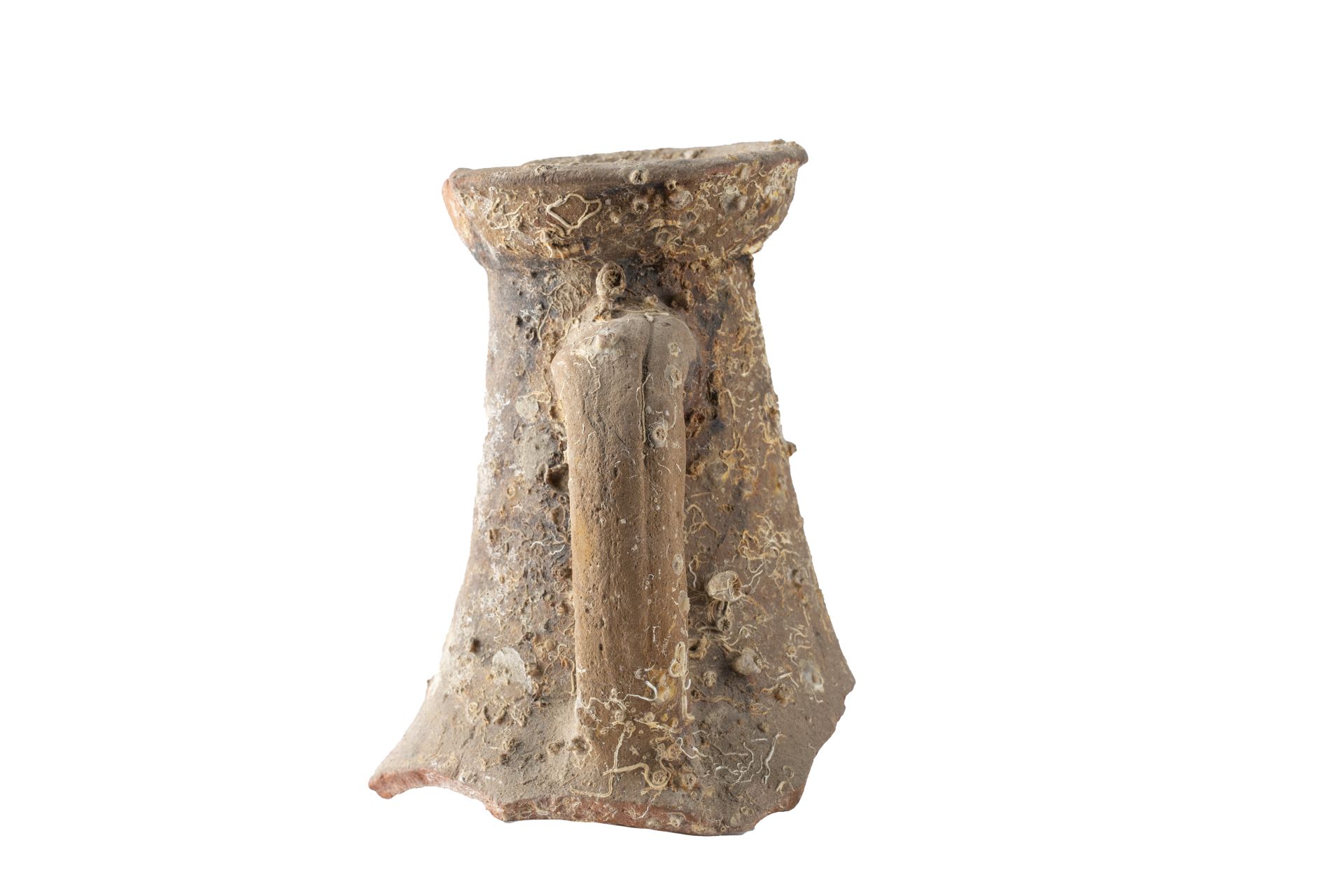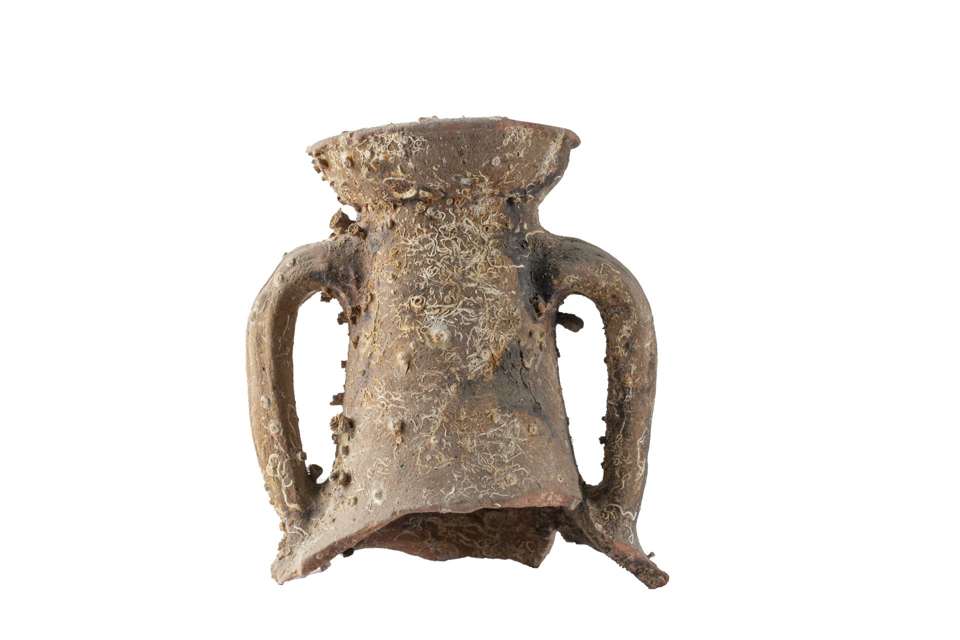 - NOTIZIE STORICO CRITICHE La forma è caratterizzata da un orlo a corolla molto estroflesso, con labbro ripiegato su se stesso, distinto dal collo quasi cilindrico e allungato. Le anse sono a nastro, dal profilo a volte a orecchia, ma più spesso a maniglia, impostate sul collo e sulla spalla. Il corpo è stretto e cilindrico, con il fondo a lungo puntale cilindrico pieno e appiattito alla base. Gli impasti variano dal rosso, al rosso rosato, all’arancione con ingubbio giallo chiaro o bianco/ grigiastro. Le dimensioni si collocano nella media già documentata per il tipo, con un diametro massimo dell’orlo di 15 cm. La cronologia di questi contenitori la cui produzione è quasi certamente tunisina ed era adibita al trasporto di olio e, in misura minore, di salsa di pesce, va dalla fine del IV alla prima metà del V secolo d.C