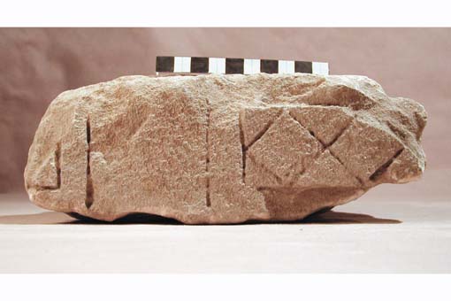 frammento a forma di triangolo isoscele, con un lato (corrispondente all'ipotenusa) arrotondato, relativo a parte inferiore di stele con ornamenti