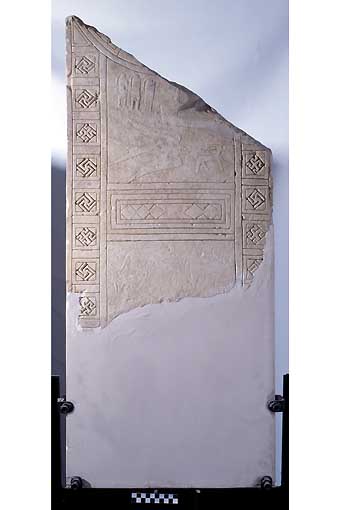lastra di forma trapezoidale, pertinente a parte centrale di stele con ornamenti