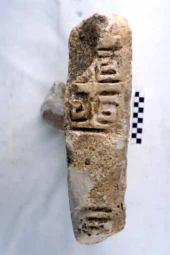 frammento di forma rettangolare, pertinente a parte superiore di stele; lato A reimpiegato per il testo di una iscrizione medievale