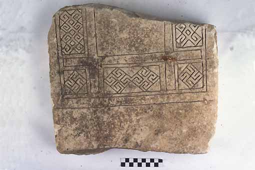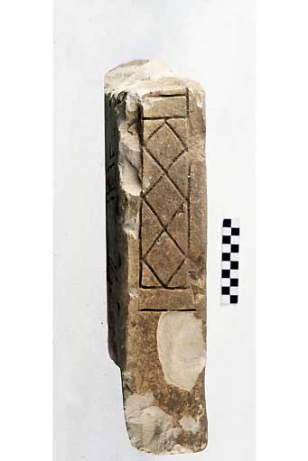 frammento di forma approssimativamente rettangolare, pertinente a parte inferiore di stele con ornamenti