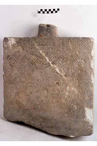 lastra pertinente a parte superiore di stele con armi, conservante il collo troncoconico privo di decorazioni, con foro quadrangolare nella parte superiore