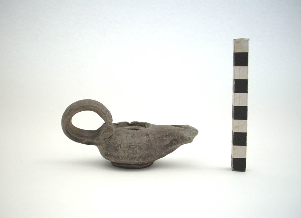 Lucerna a pasta grigia; piede ad anello; serbatoio a sacco con foro di alimentazione depresso; becco ad ancora; ansa a nastro chiusa ad anello. Verniciata in grigio