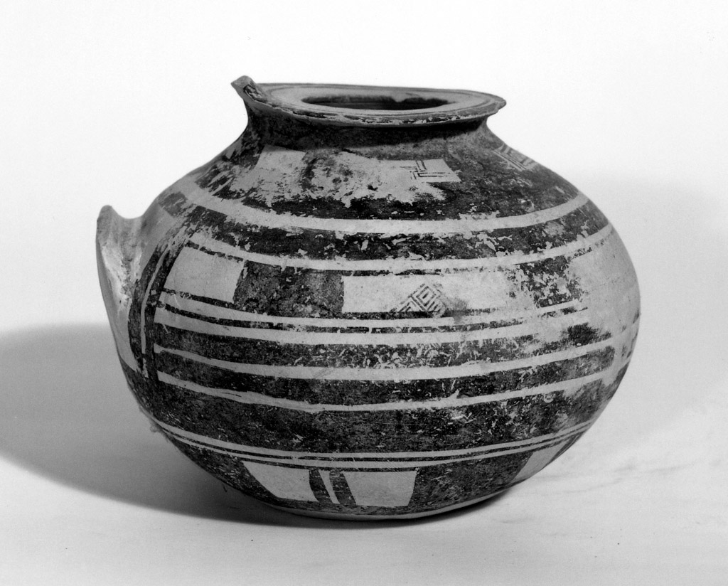Colore nero. Decorazione a fasce parallele intervallate, sulla spalla e in prossimità del fondo, da serie di rettangoli campiti e risparmiati, questi ultimi con triangoli iscritti
