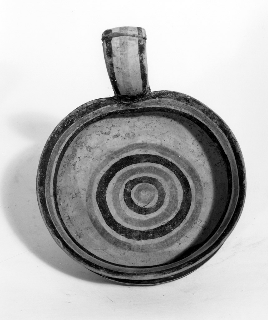Colore rosso-bruno.Interno: cerchi concentrici a fasce orizzontali; esterno: triangoli campiti alternati ad elementi stilizzati, linee verticali e serie di losanghe entro riquadro; sul fondo: ruota a otto raggi