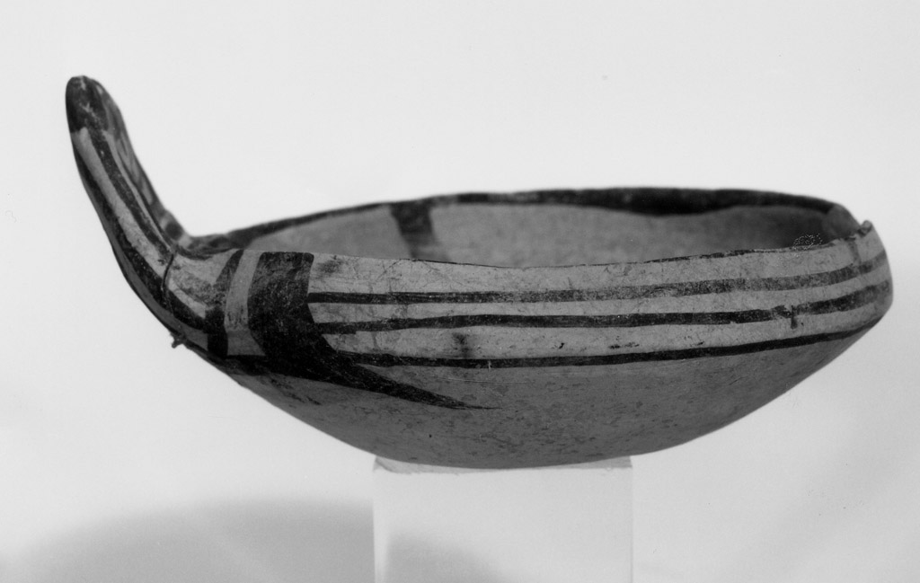 Interno: figura umana stilizzata; esterno: linee orizzontali parallele tra triangoli internamente campiti