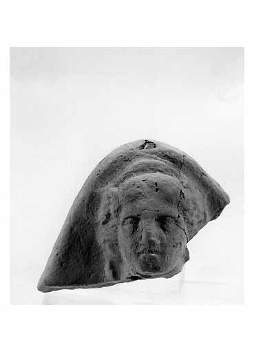 volto rotondo, occhi grandi, naso appena schiacciato, labbra serrate; i capelli a riccioli sono ravviati indietro; sul capo un diadema (?); velo discendente sulle spalle; retro cavo
