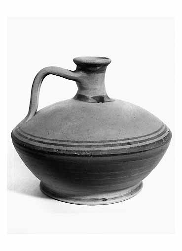 labbro svasato; basso collo cilindrico; corpo biconico con spigolo vivo; piede troncoconico con cerchio inciso all'interno; ansa tricostolata impostata quasi ad angolo