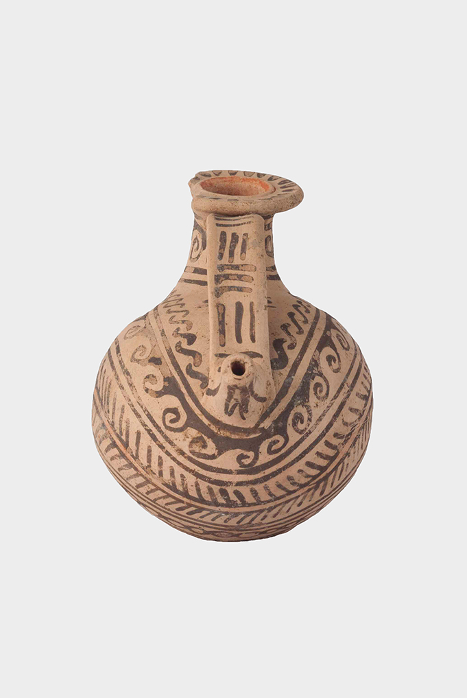 askos a base piatta; corpo quasi emisferico; corto collo cilindrico; labbro piatto svasato; ansa a nastro impostata orizzontalmente tra la parte posteriore e il collo; parte posteriore terminante con un beccuccio allungato e a profilo svasato